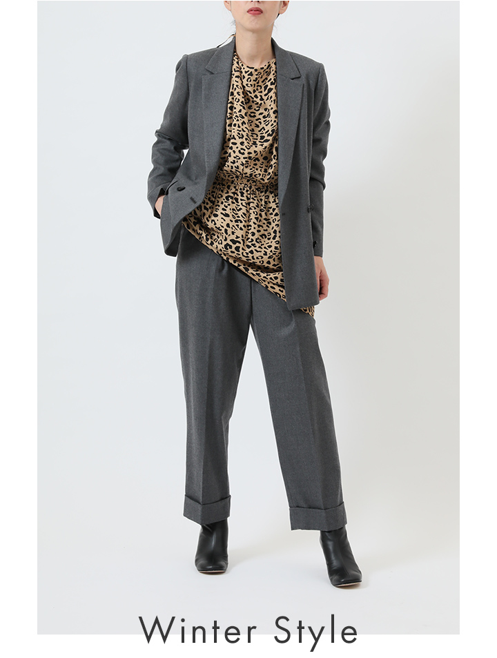 レオパードブラウス。マニッシュなフラノ素材のセットアップに、 レディなディテールが効いたとろみブラウスをさしこんで、 甘辛ミックス。