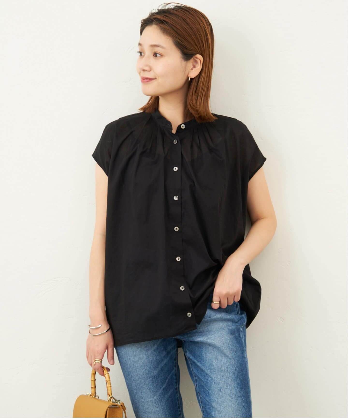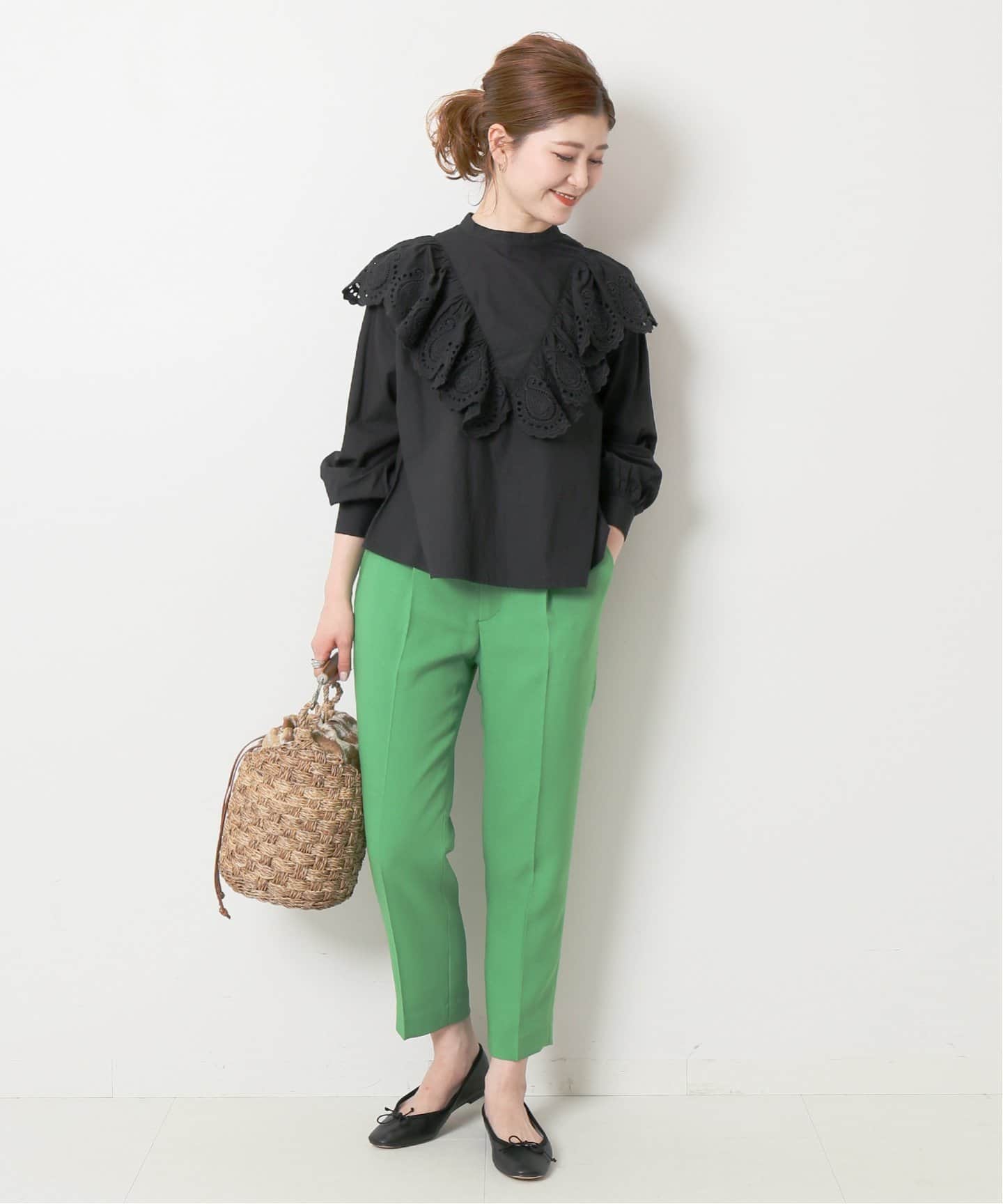 甘辛具合がちょうどいいこなれアイテムSpick & Spanのベルテッドミリタリージャケットは、品と抜け感を感じさせるこなれアウター。甘いスカラップレースのブラウスも、黒でモダンな印象に振って。