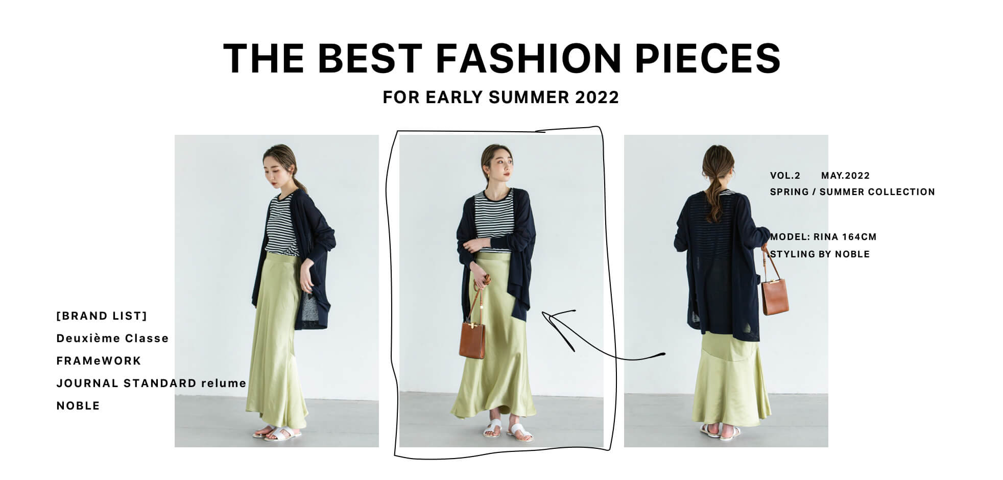 ワンランク上のフェミニンを叶えるNOBLEのオススメは、キレイめな印象を上乗せできるサテンのマーメイドスカートや女っぽい抜け感を醸すシアーカーディガン。一点投入であか抜けフェミニンが簡単に。