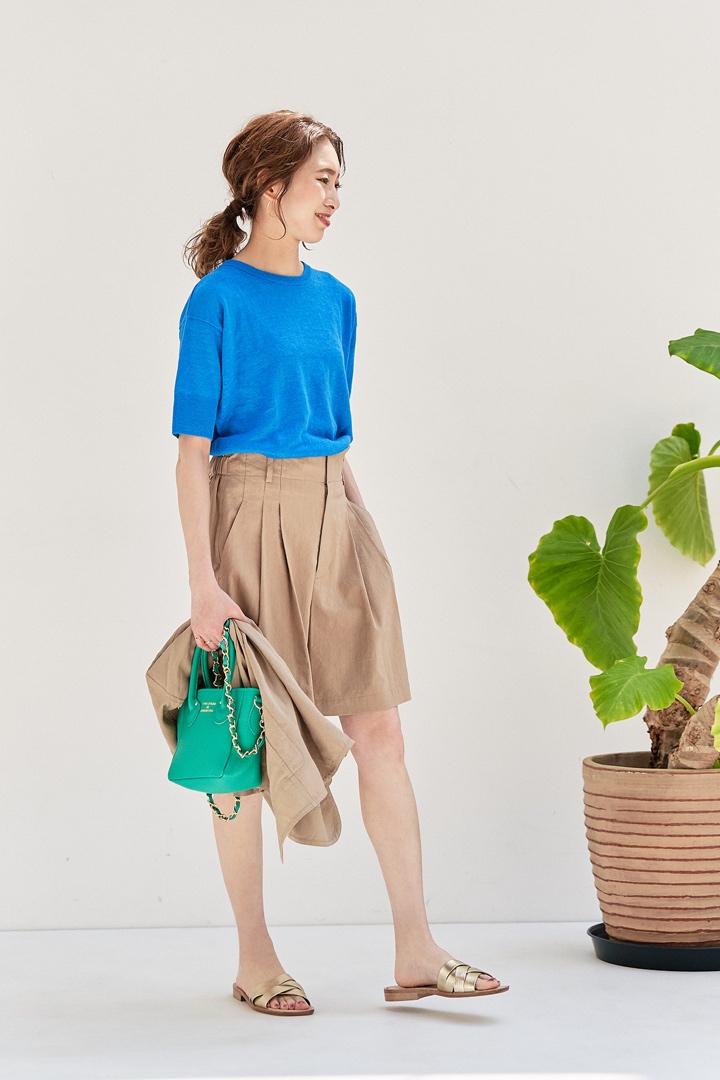 足元は馴染みがよくも締める効果のあるブラウンがマッチ。イエローとブルーは合わせやすい定番の配色。ワンピースの裾からチラリとパンツをのぞかせるだけで奥行きが出てこなれた着こなしに。足元は馴染みがよくも締める効果のあるブラウンがマッチ。