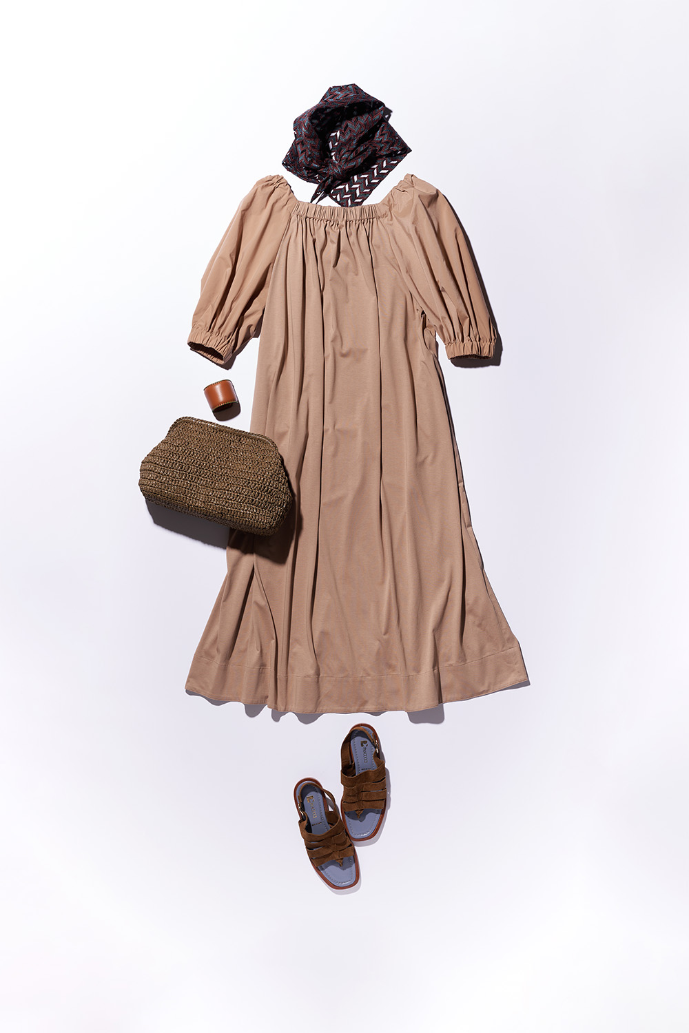 ベージュ×キャメル〜カーキのワントーンコーデは私がこの夏挑戦したい着こなしです。パフスリーブやAラインなど甘さのあるデザインのベージュのワンピースに、夏らしいサファリカラーを合わせるとハンサム要素がプラスされて良いバランスに。スカーフも軽めの素材を選ぶことで、長めの着丈のワンピースコーデにも抜け感が出ておすすめです。
