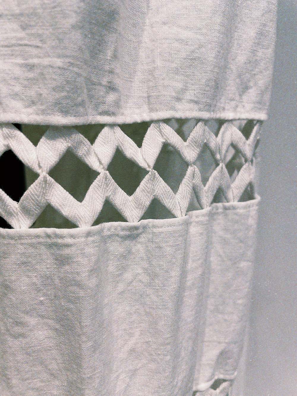 ブレードの穴をボタンホールにしているところも、アンティーク感があって可愛いです。今回、最もこだわったのがこのブレードです。表面の生地と同じ糸を用い特注で編み立てたものをあとからミシンで縫い付けているので、立体感がありとても可愛らしいです。