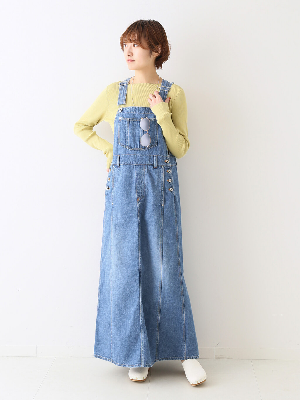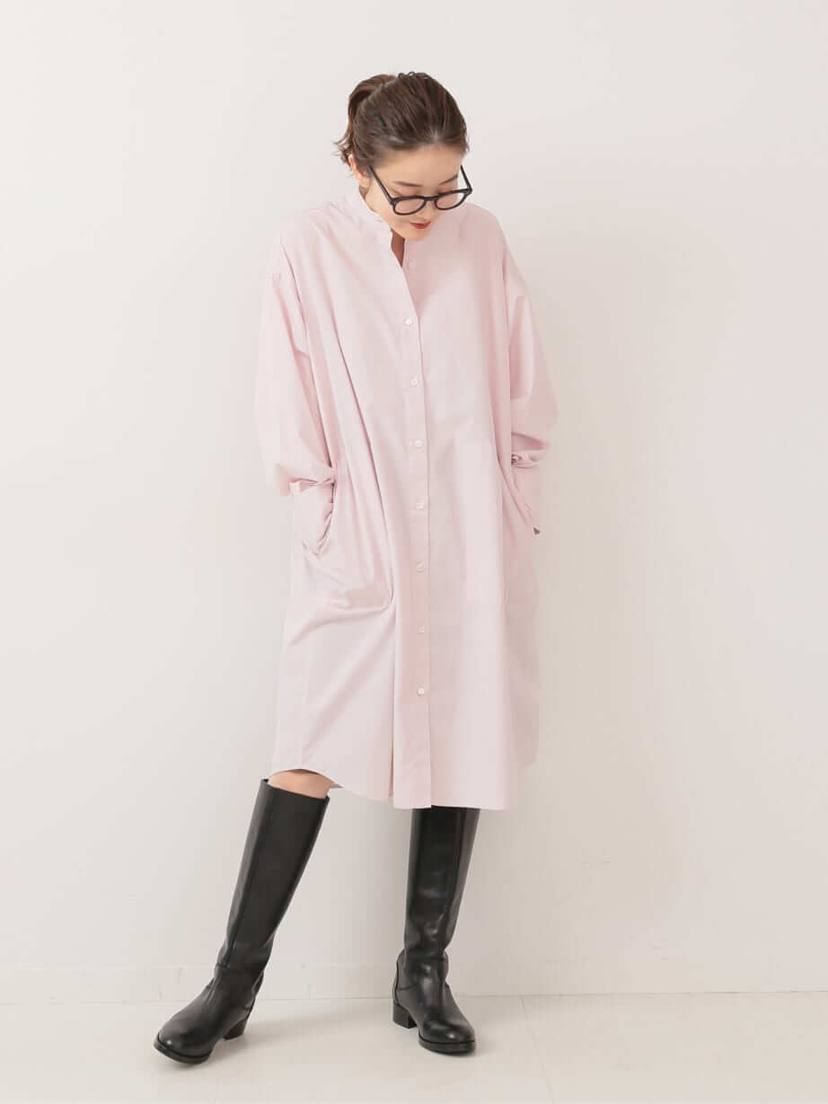 旬が香るレイヤードに注目!大きなパッチポケットやカフスが効いたバンドカラーワンピースには、黒ブーツを合わせてモードにシフト。デニムオーバーオールのインナーはトレンドのイエローをプラス。