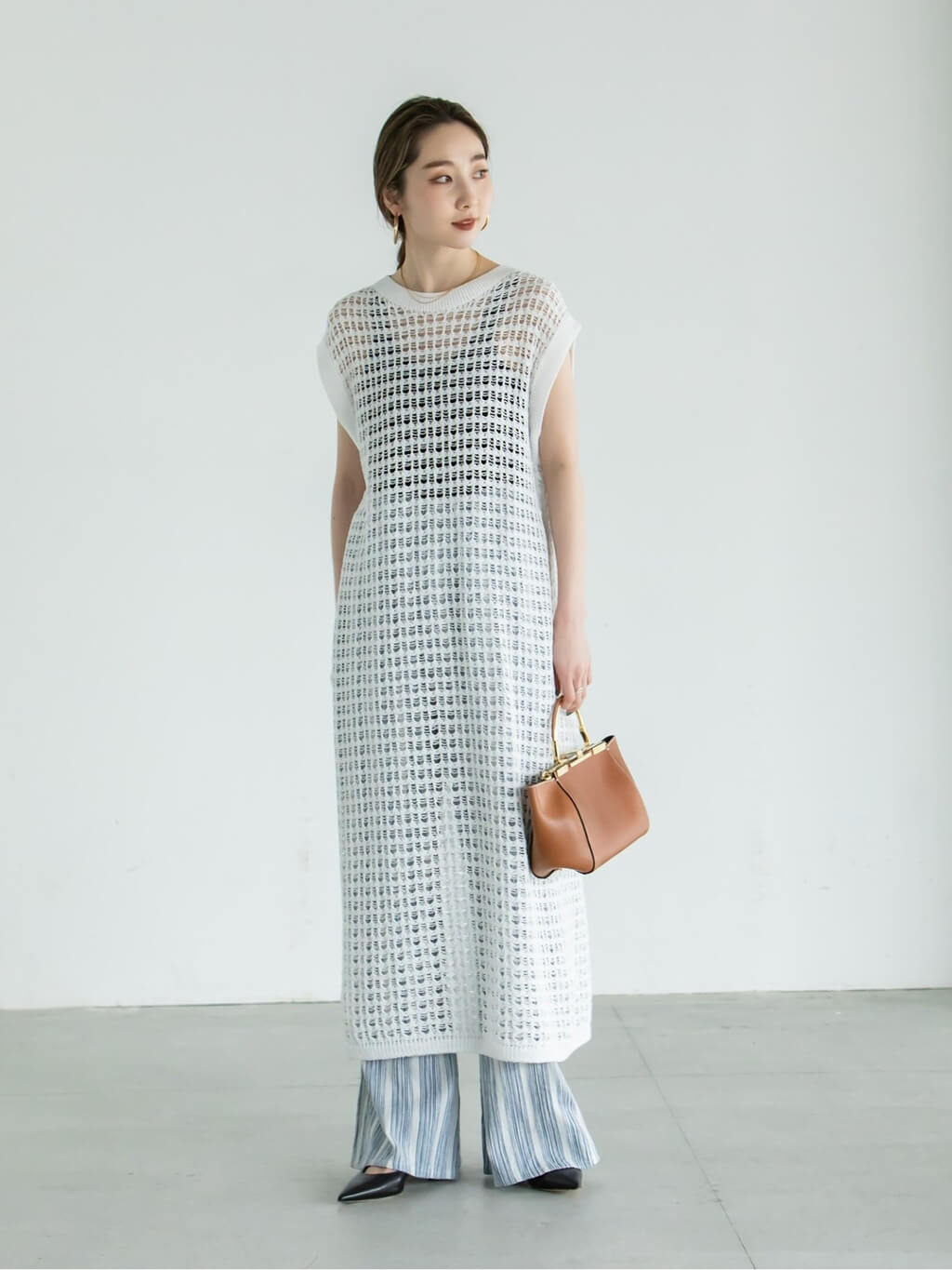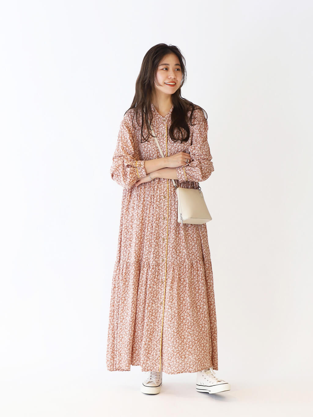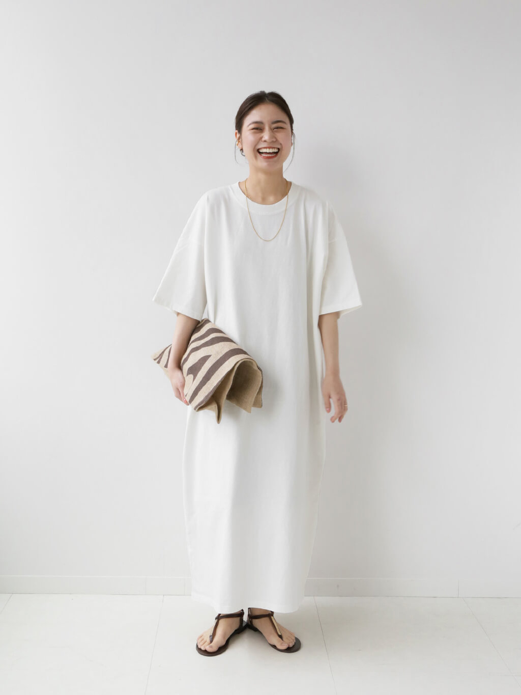 青空の下に映える爽やかなワンピースコーデレトロガーリーなフラワーワンピースに白のバッグ&シューズをトッピングしてクリーンに。シンプルなカットソーワンピースは映えるアクセサリー&リゾート小物が好相性。