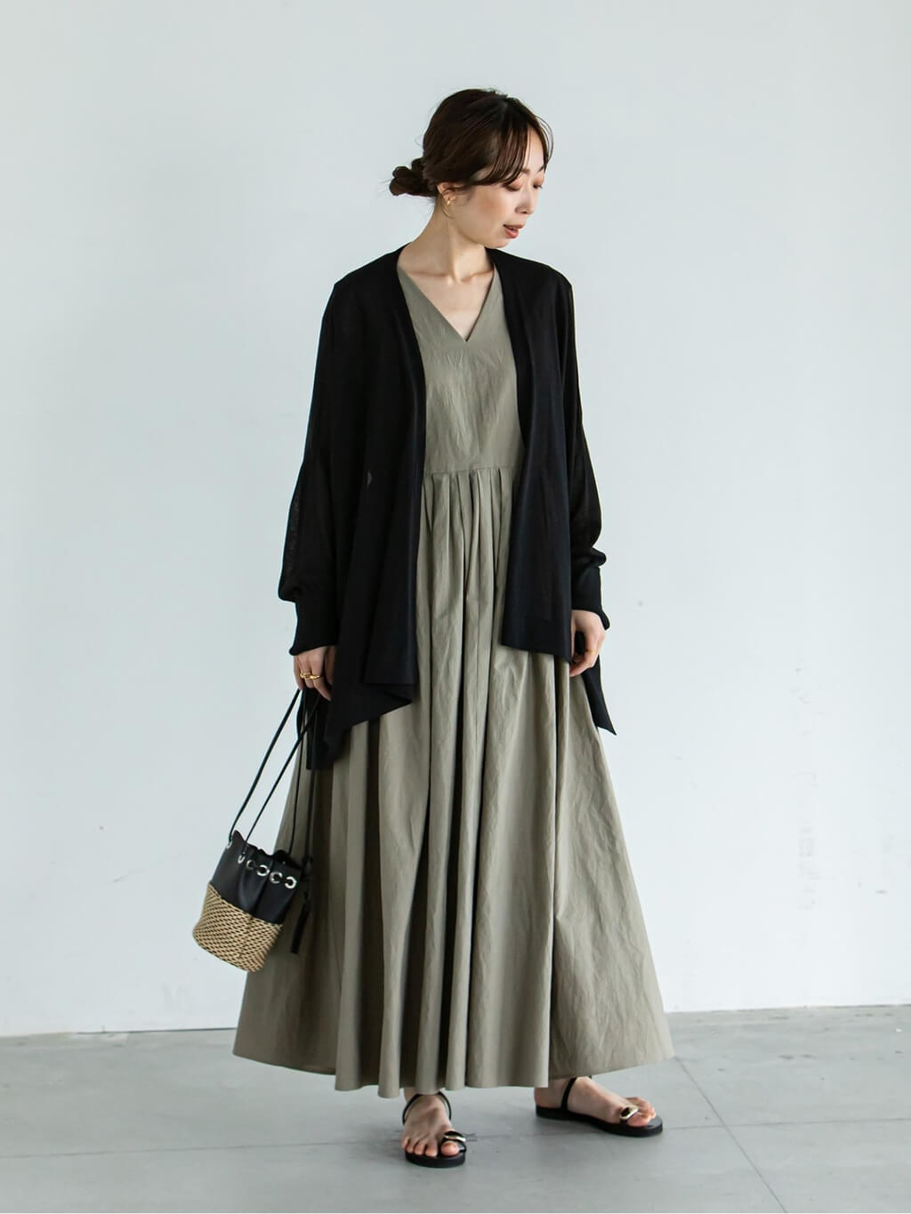 ドラマティックな甘ワンピを大人に着こなす大人気のMARIHAのドレスは甘さをおさえたオリーブをセレクト。ギャザーをたっぷり寄せた甘ワンピースには、黒のシアーカーディガンを羽織ってメリハリを効かせて。