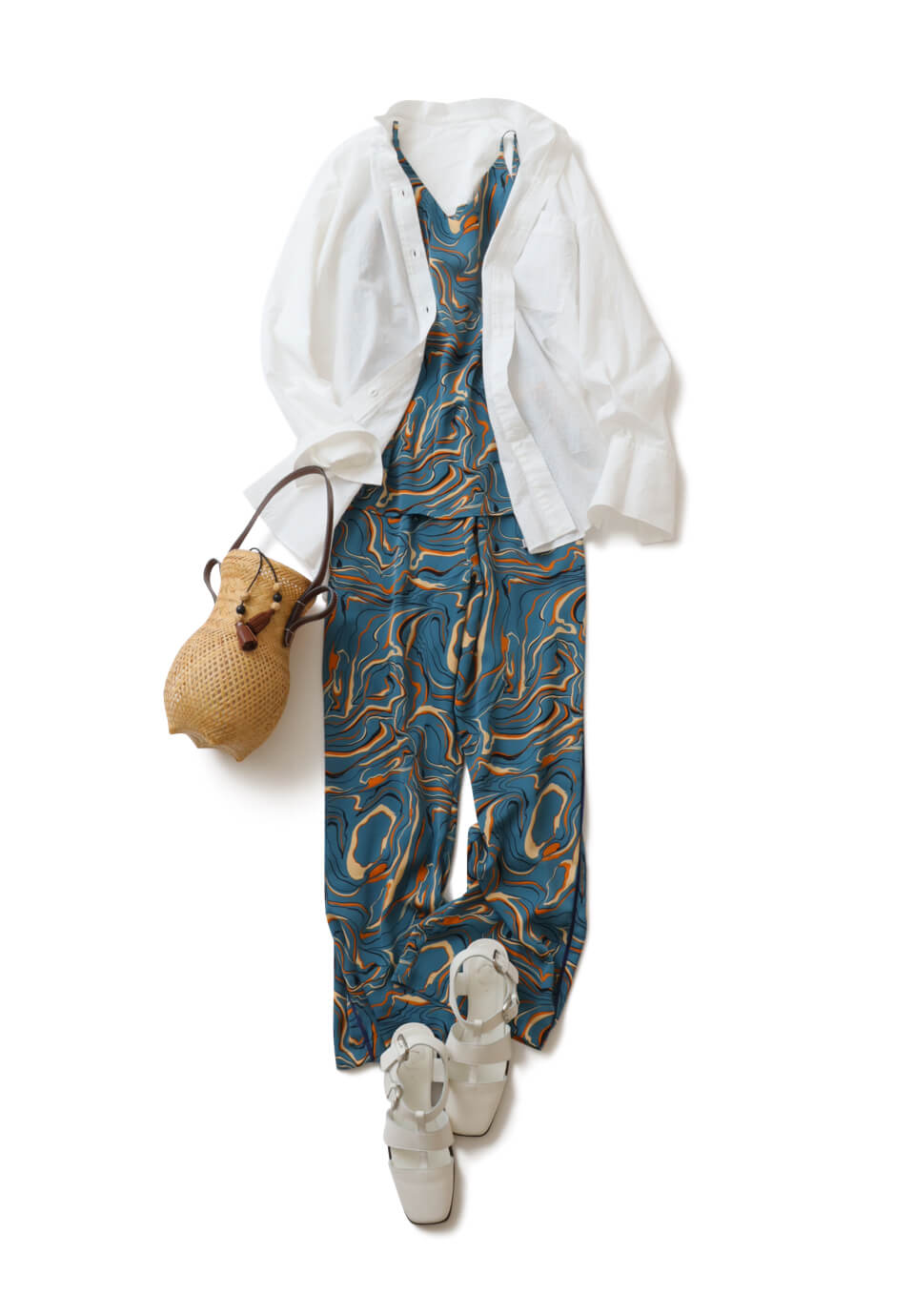 マットなブルーにマルチカラーのマーブル模様をのせたキャミソール&イージーパンツをセットで。すとんとした落ち感のあるキレイめな素材なので部屋着感がでず、モードな雰囲気たっぷり。オーバーサイズの白シャツをさらりと羽織ることで、爽やかな大人のデイリーコーデに着地。