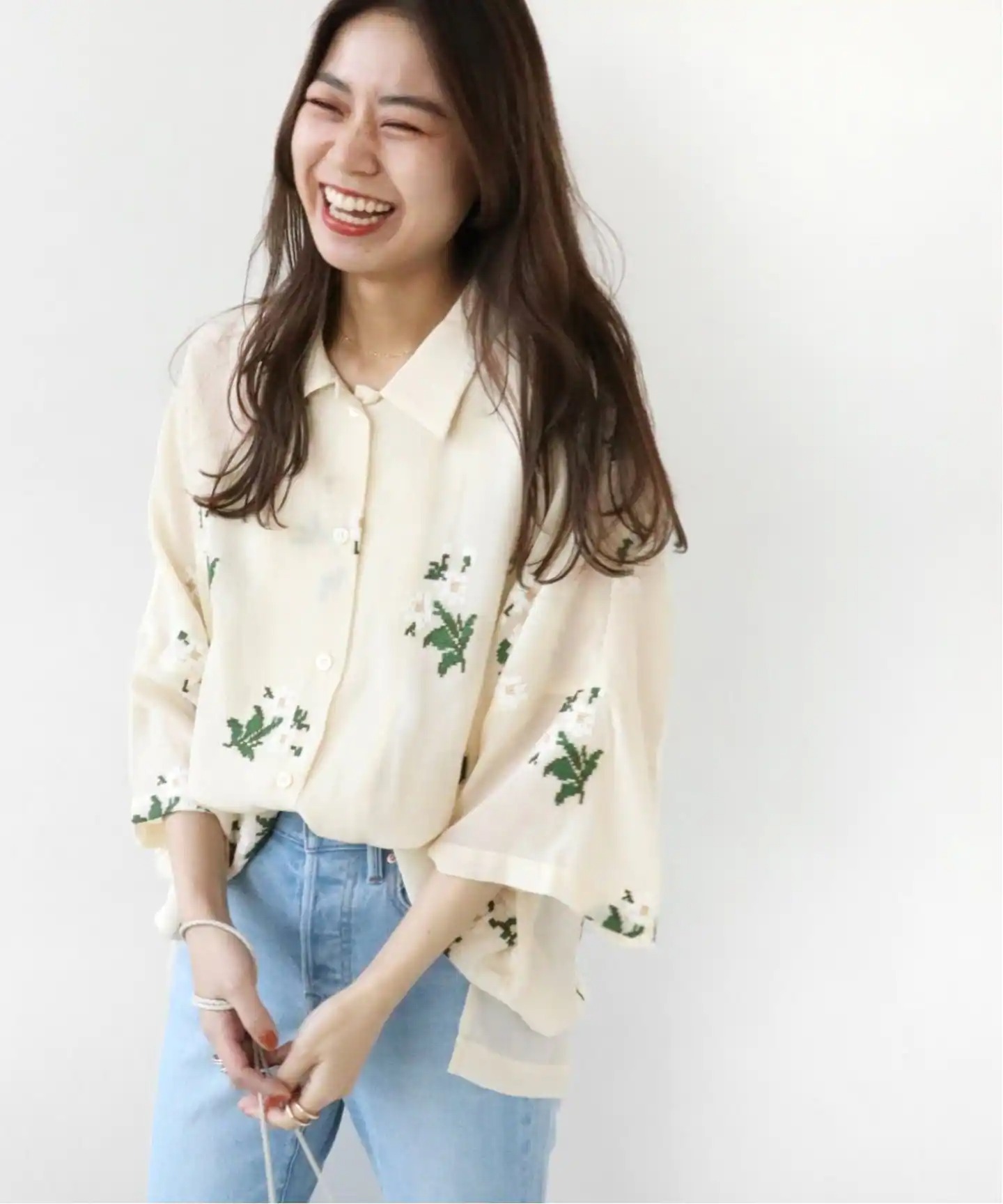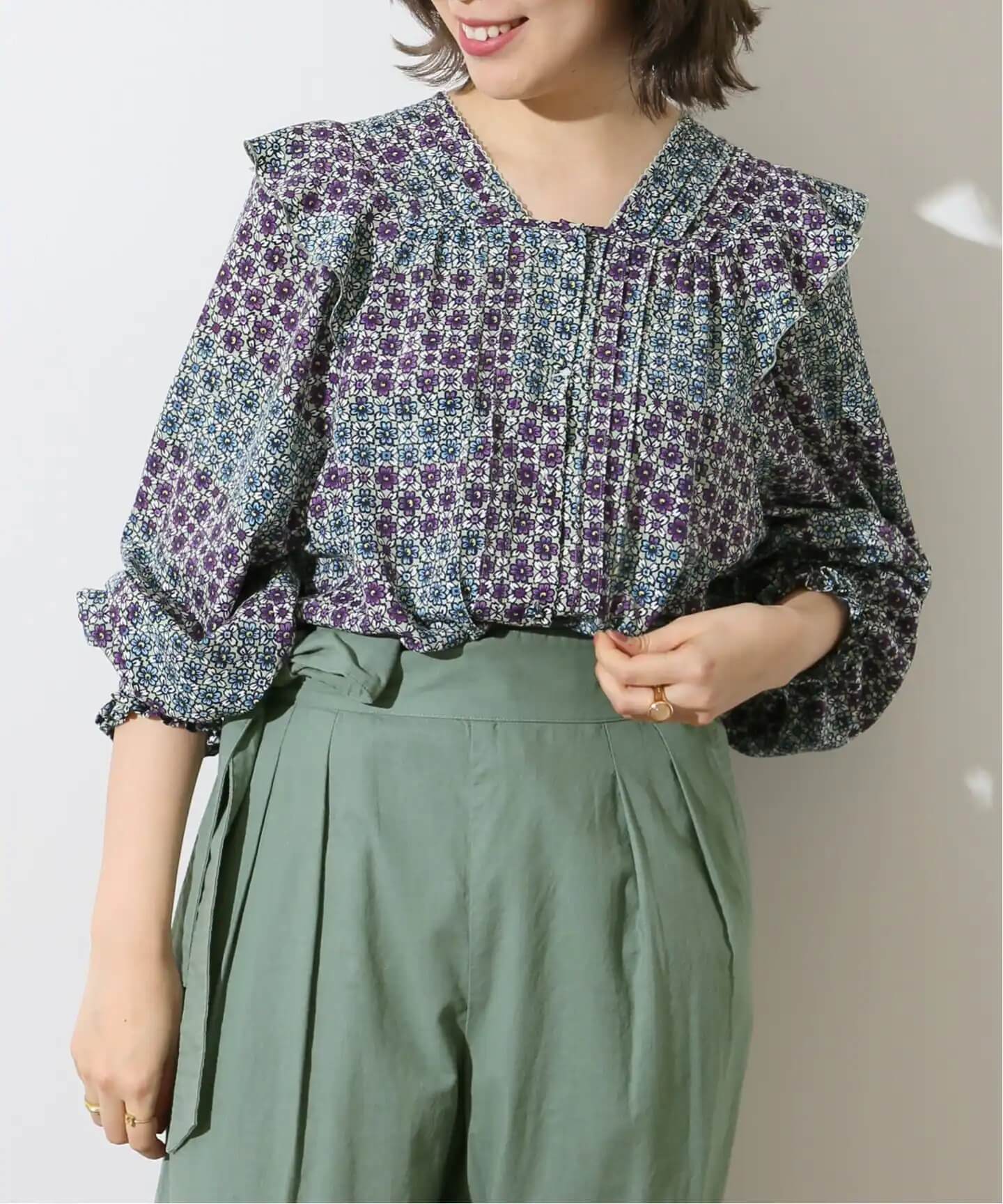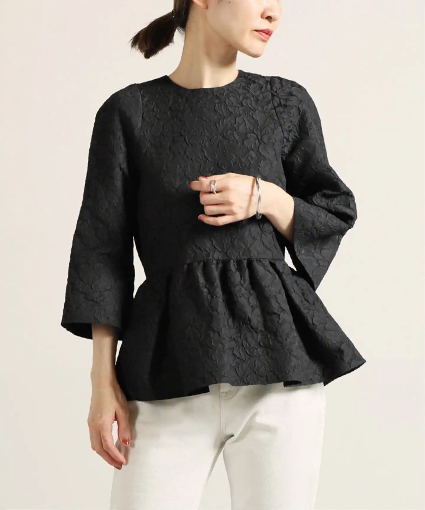花柄ワンポイントを効かせたブラウストップスで花柄を持ってくる時は、やりすぎない配色やバランスに気を配って。モザイク調のプリントブラウスや、ジャカードで花柄をのせたペプラムブラウスがおすすめ。