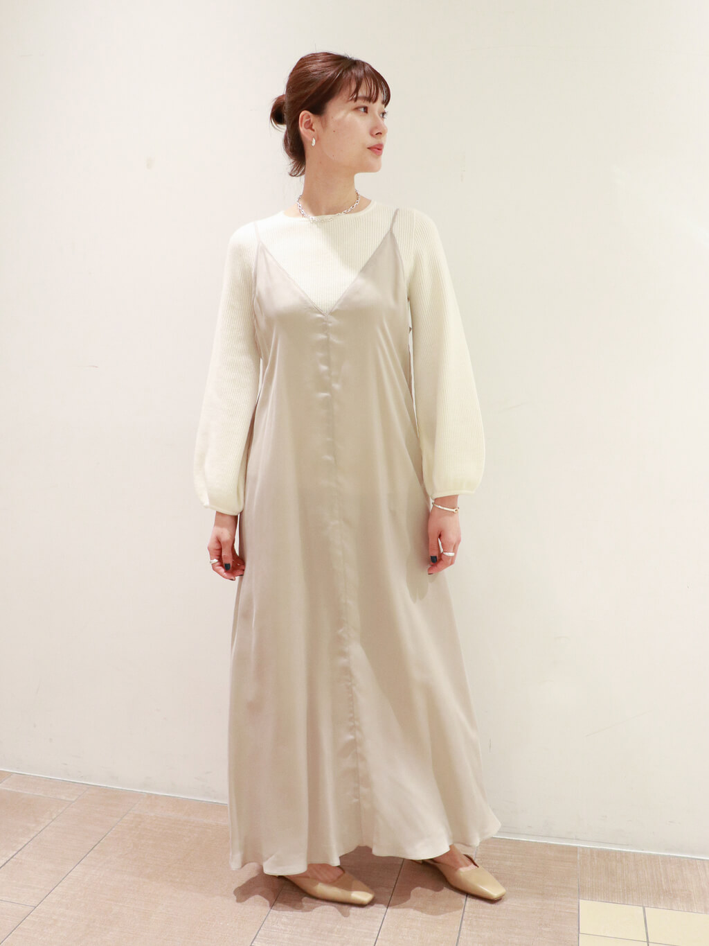 クルーネックのニットと重ねて、女性らしさを加えて。