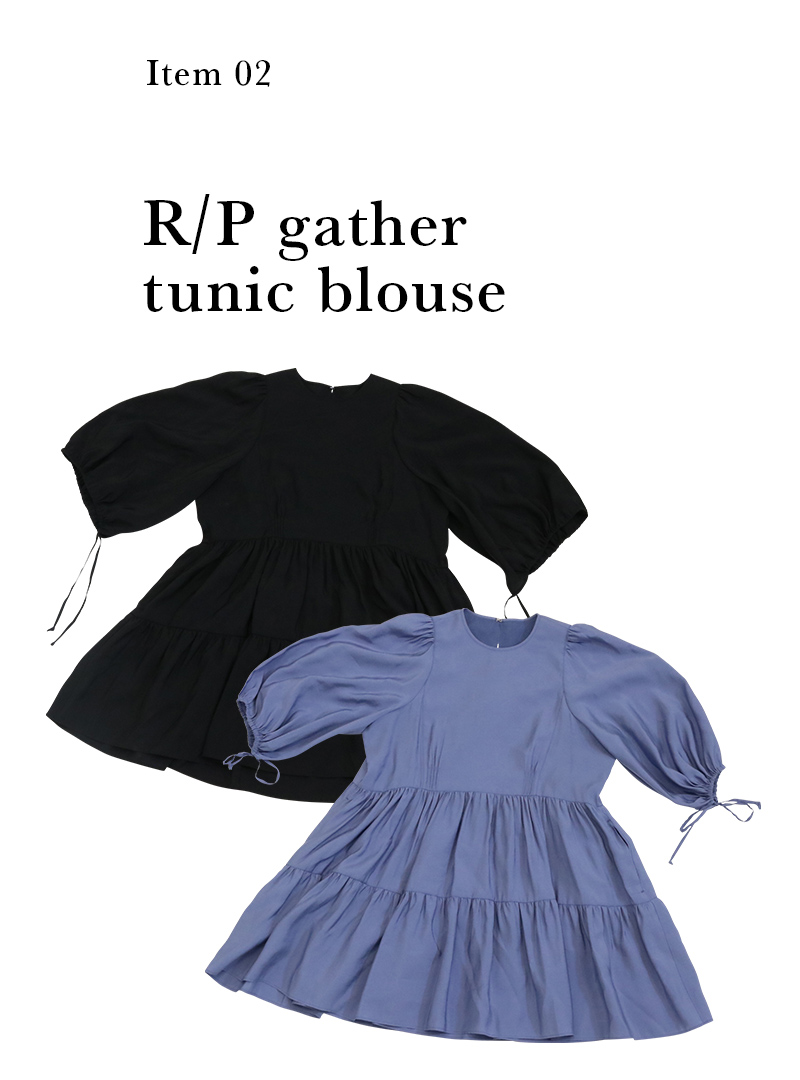 ふんわりとした素材の、落ち感が綺麗なチュニックブラウス。袖とウエスト下のボリュームがポイントのティアード型。袖の絞り方で印象がグッと変わります。サラッと1枚でミニワンピースとしてでもおすすめ。