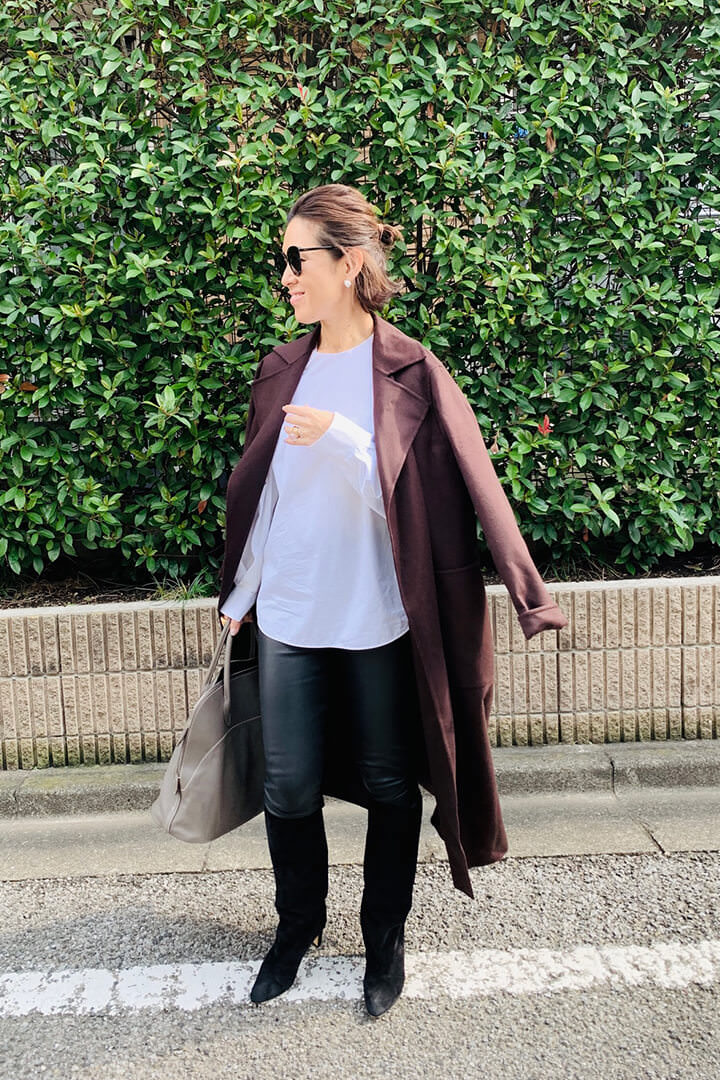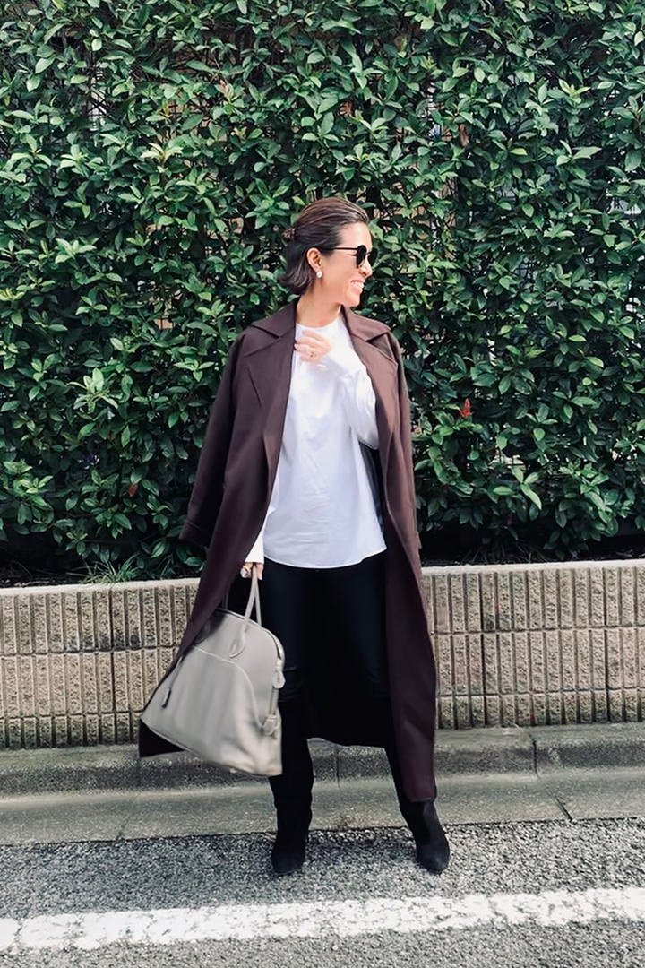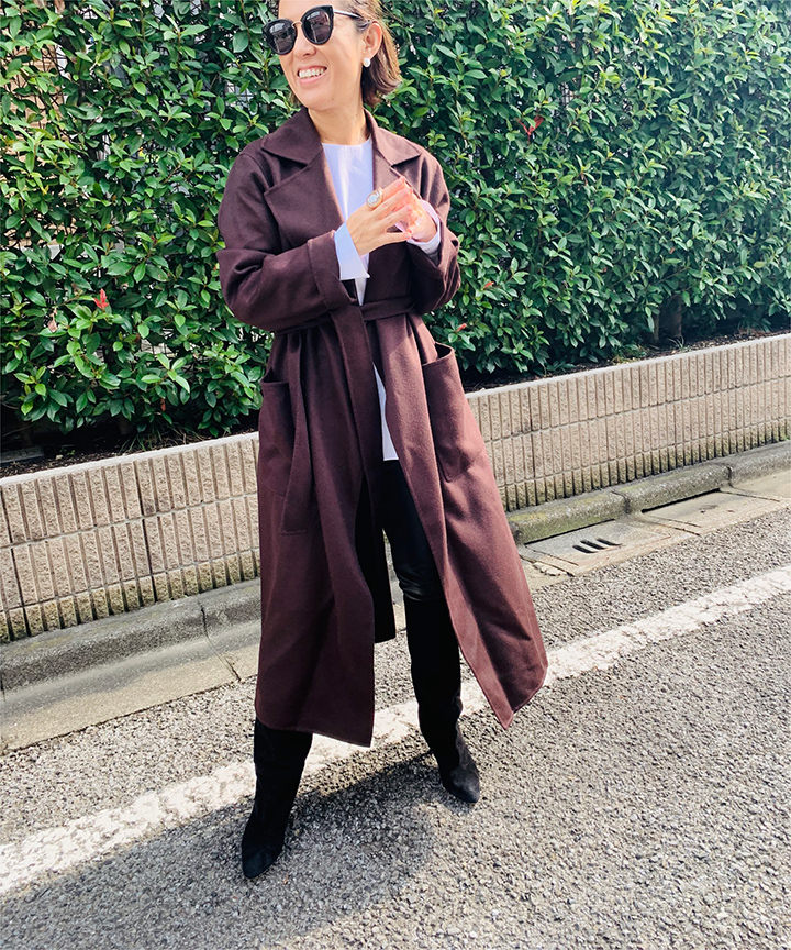 - コニャックのようなドラマティックなブラウン。コニャックは、ブランデーの一種で、深く甘い色が特徴のお酒。そんなコートを着たら、熟成した女性らしさがきっと表現できるに違いない(笑)。と期待して、着てみました! チョコレートのようなブラウンとも、強さのある黒ともまた違う、マチュアな女っぽさが表現できるような気がします(自分比)♡