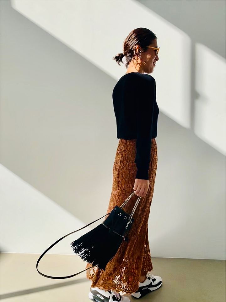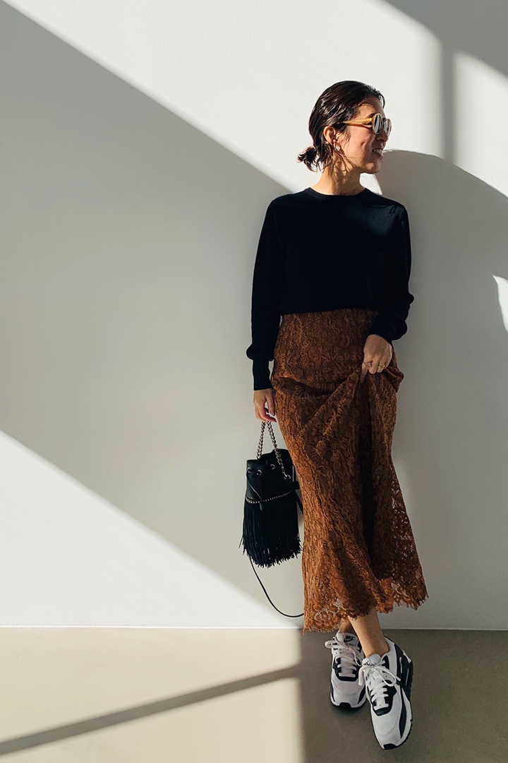 少しスポーティにしたいときは、ナイキのスニーカーで。 - VERMEIL par ienaモールレース マーメイドスカート◆¥22,000(税込)