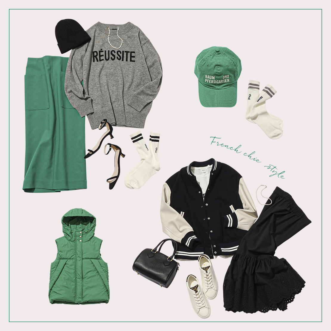 スクールニットやガンクラブジャケットなどのトラッドアイテムに、パリのヴィンテージショップに並んでいそうなエンブロイダリースカートやリンスデニムといったヴィンテージライクなアイテムをミックスするフレンチシックなスタイル。春夏大ヒットしたグリーンは秋冬シーズンも注目カラー。
