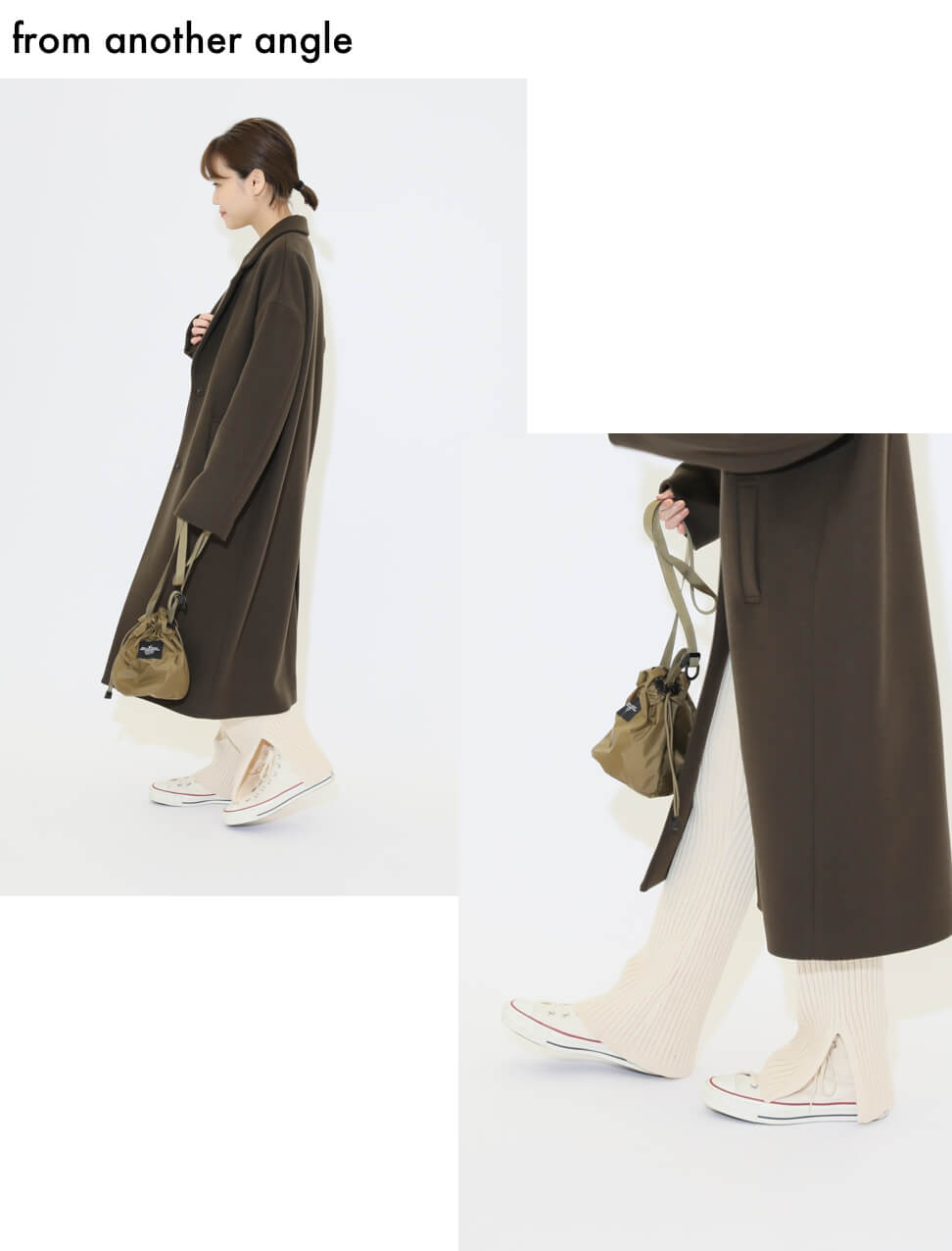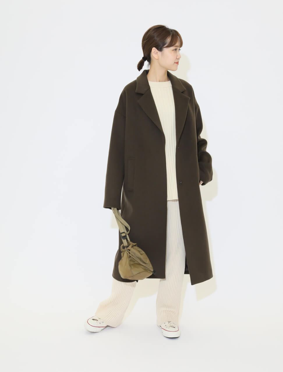 - マスキュリンなイメージにまとまりがちなブラウンのテーラードコートを、旬のカフェオレ配色で女っぽくシフト。肩の力を落としたリブパンツやコンバースのスニーカーで、さりげなく抜け感を添えて。