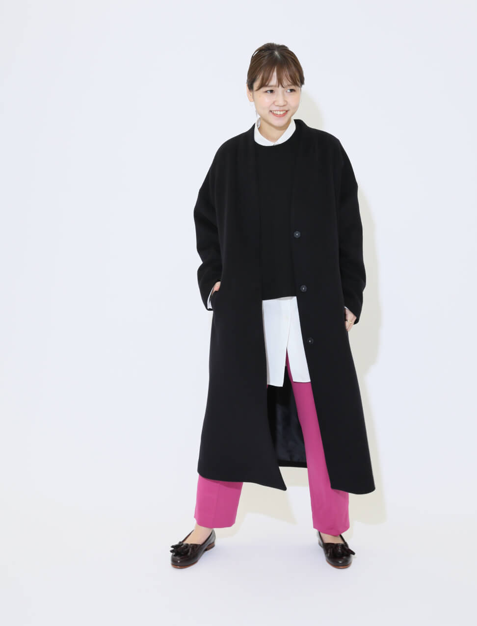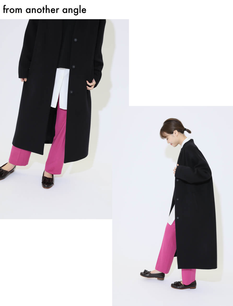 - ミニマルな印象のブラックコートを、差し色で遊んでモードに振ったコーディネート。ブラック&ホワイトに効かせたフューシャピンクのパンツがアクセントに。端正なコートで優しく包みこむから、きちんと感もしっかりキープ。