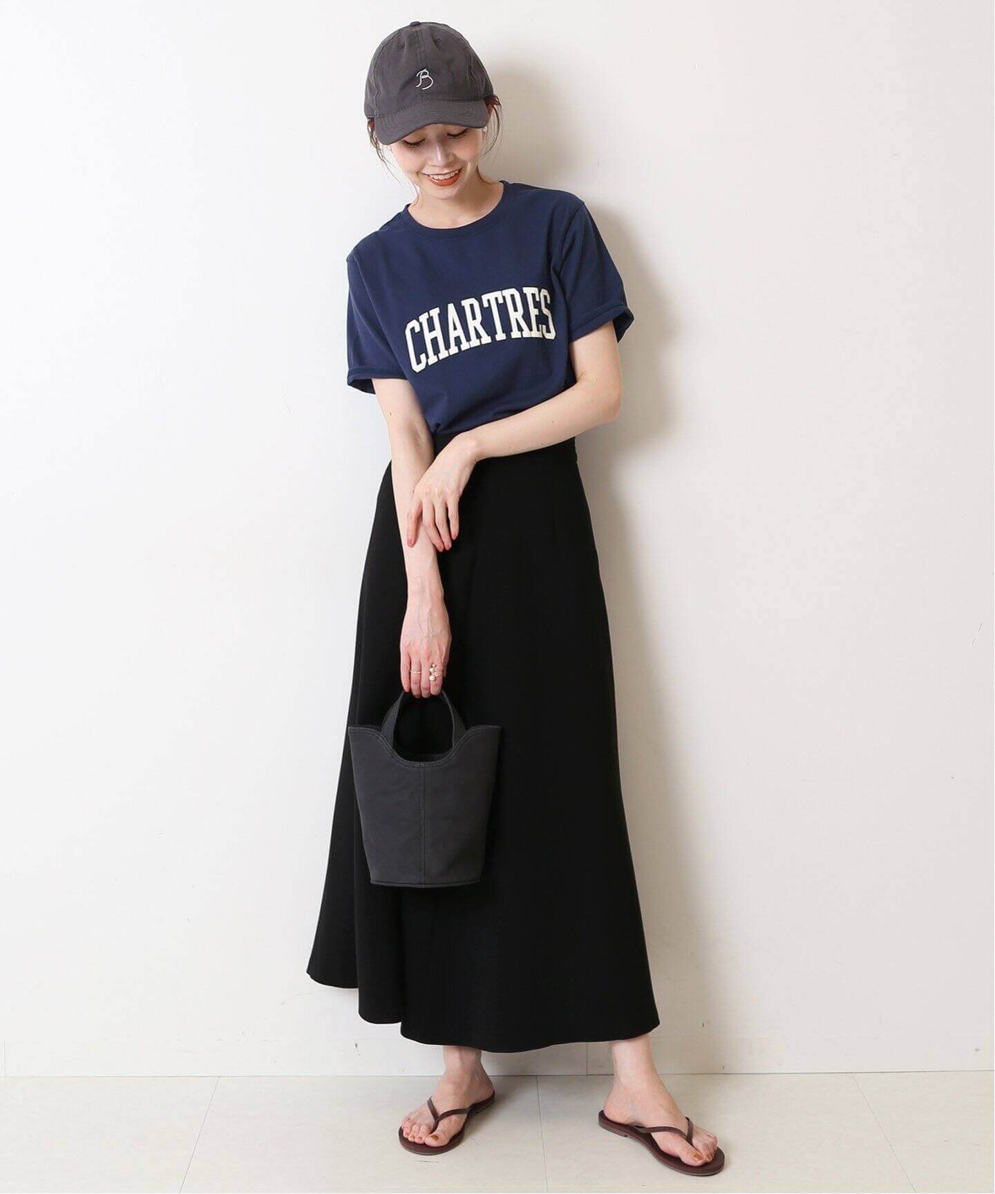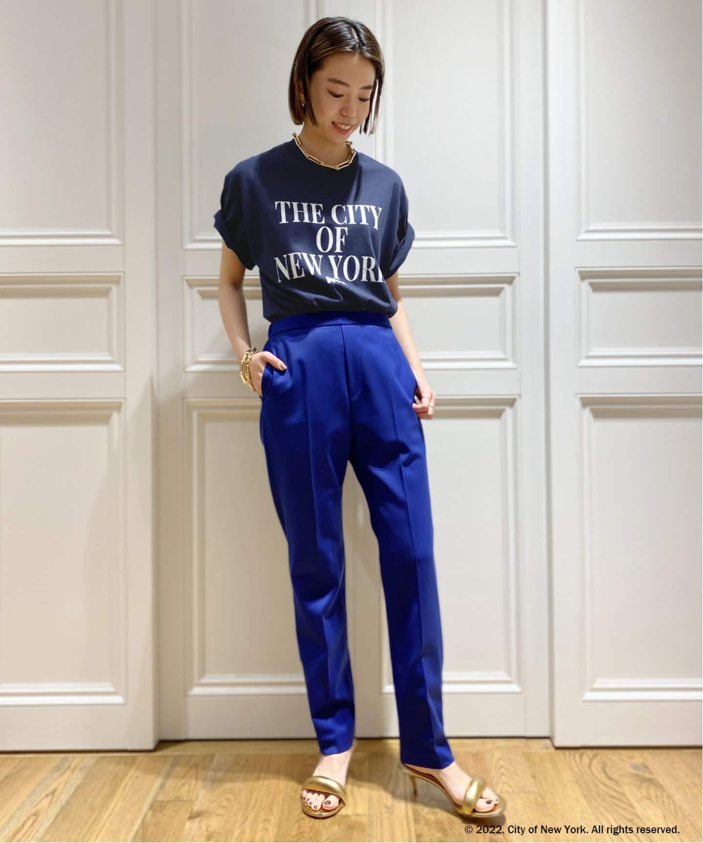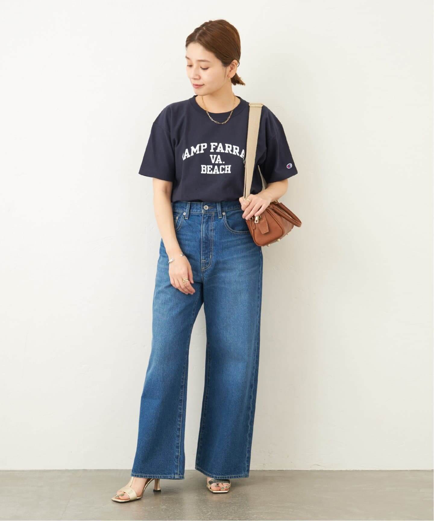 ネイビーが一番大人っぽいカジュアルよりもトラッドなムードを引き寄せるネイビー。ロゴTシャツも子どもっぽく見せず、都会的に。ネックレスやピアスをトッピングして大人っぽく仕上げて。