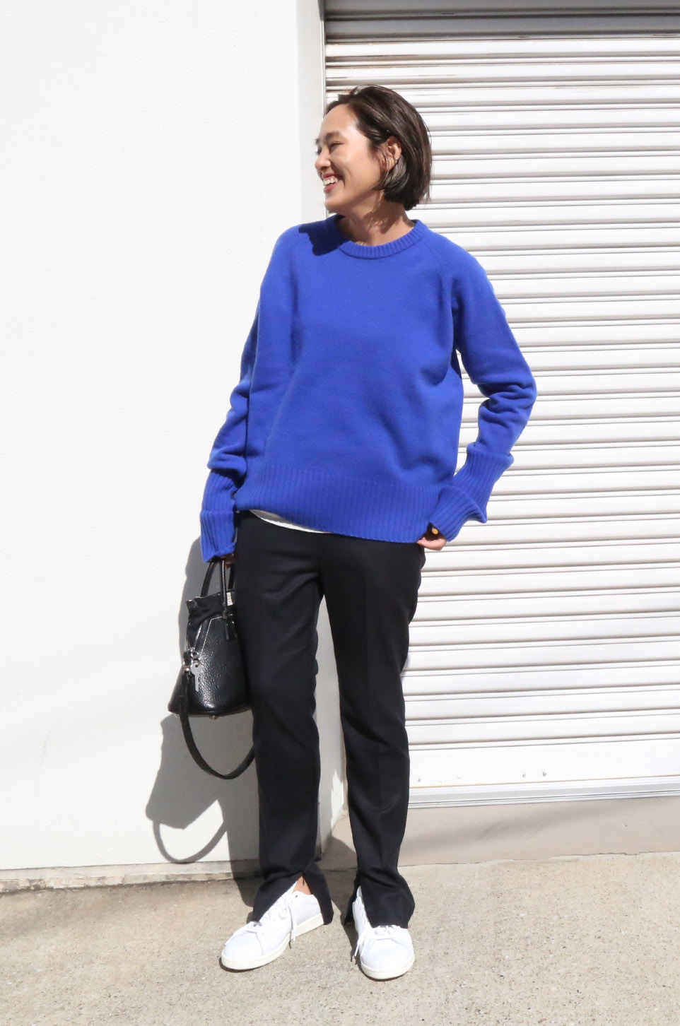 新鮮なブルーのニットはイタリア糸の鮮やかな色合いがポイント。