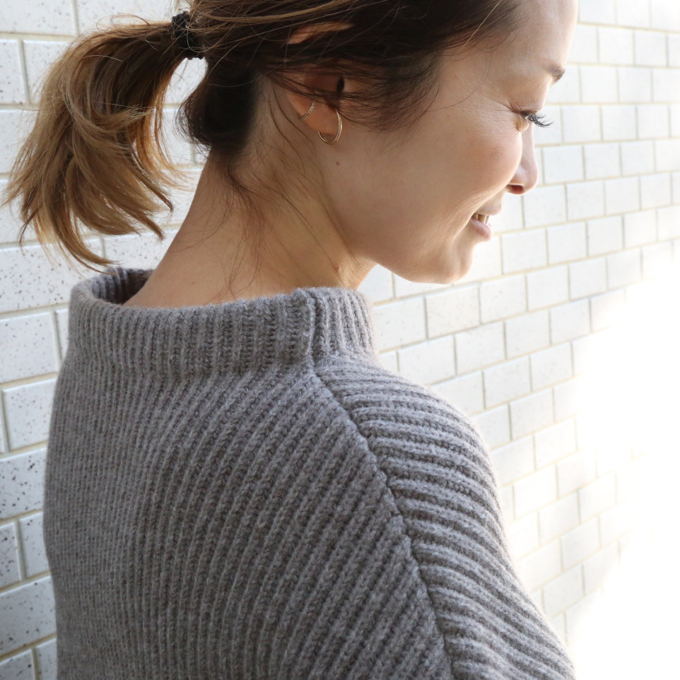 品の良いニュアンスカラーのグレージュ。 ボトルネックのデザインがデコルテを女性らしく、綺麗にみせてくれる“美人ニット”