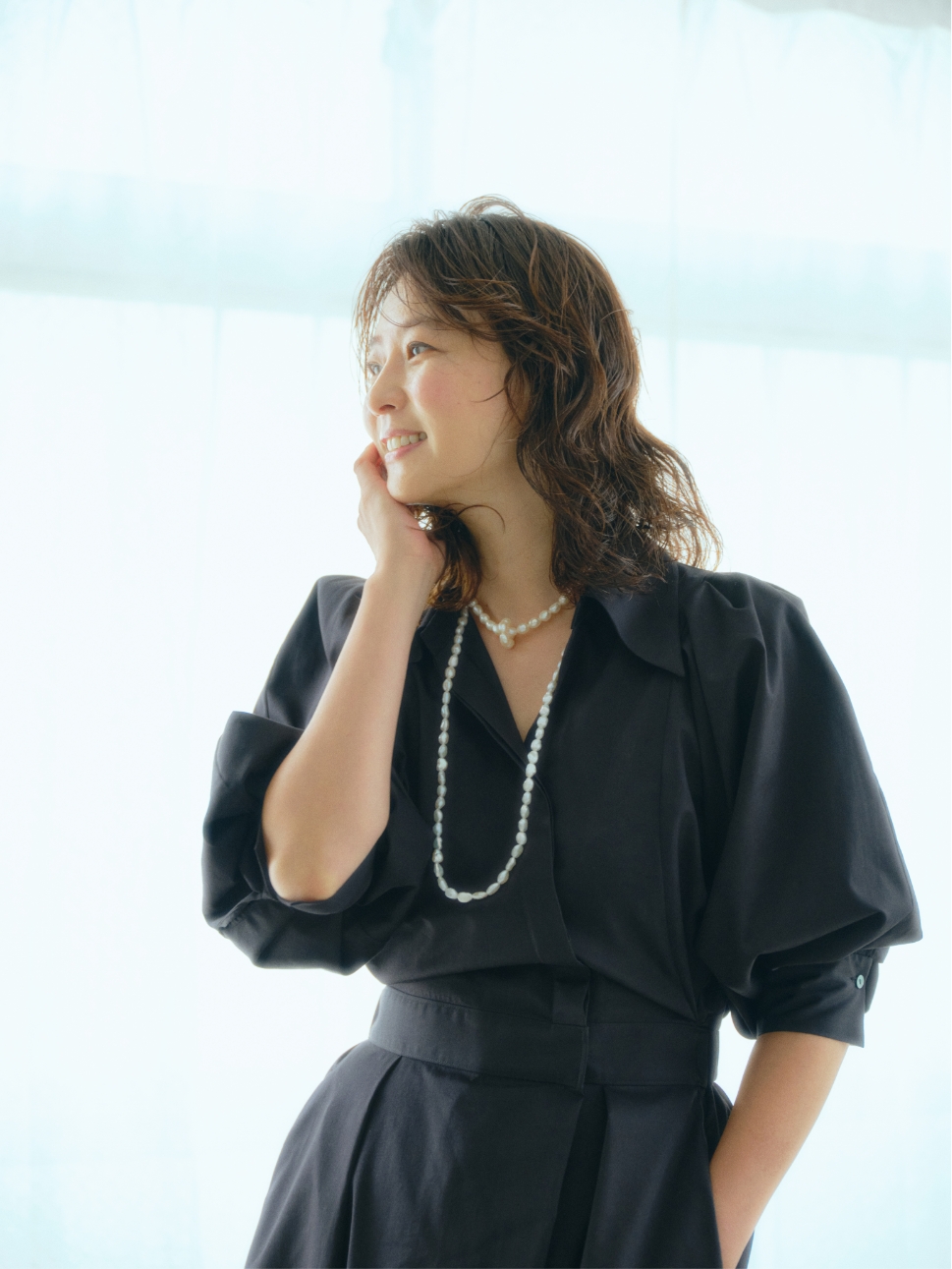 ― 五明さんにとって欠かせないアイテムは何ですか?雰囲気作りの小物は欠かせません。パールの小物、スカーフ、バッグ、ソックス、マフラーなど・・・。いつものアイテムにプラスして楽しんでいます。今回のコーディネートにもたくさん取り入れました。