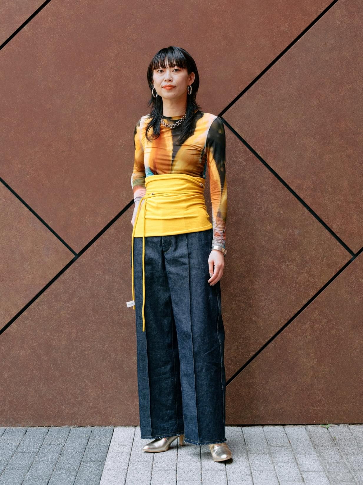 POINTシルエットの美しさや、素材、細かいディテールから、きれいめな印象を感じるデニムパンツなので、トップスは思いっきり柄やカラーを合わせてモードカジュアルなスタイリングに仕上げました。