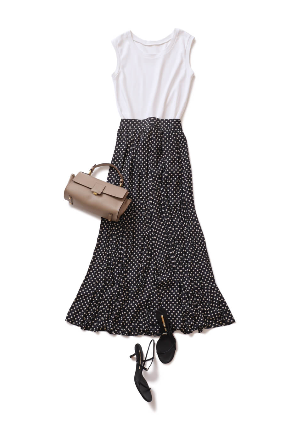 カジュアルに振らないエレガントなスカートをチョイスして、ワンツーコーデに華を添えてテンションアップ。コーデの主役は、動くたびに素敵にはためくドット柄のフレアスカート。切れ味のよい白タンクトップをタックインすることで、スカートの女らしさをいっそう引き立てて。