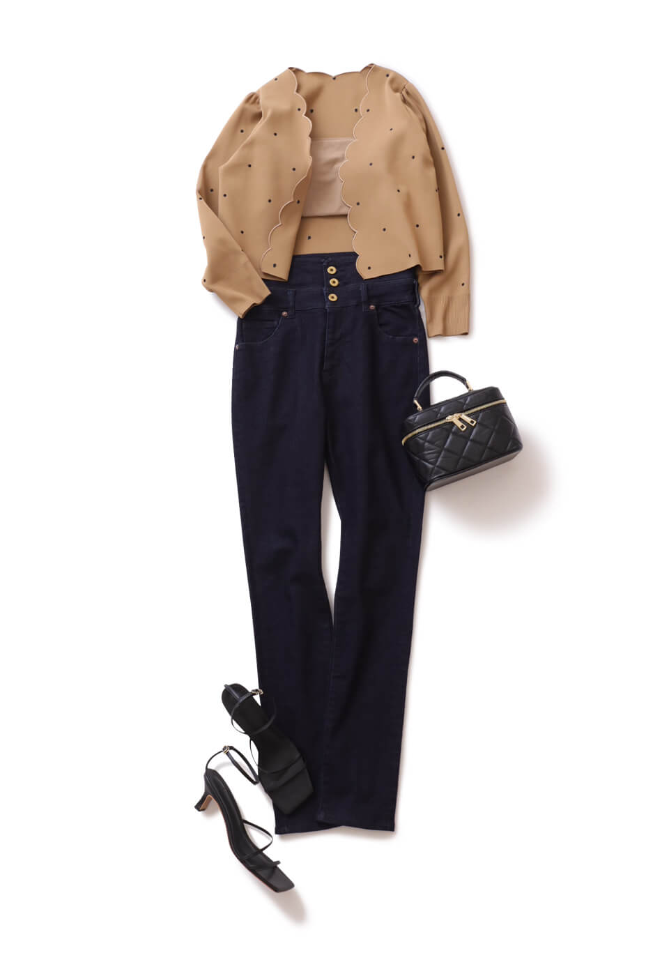 羽織るだけでシンプルコーデがぐっと華やかにアップデートできるカーディガン。ドット柄とスカラップカットが大人可愛いデザインには、同系色のベージュベアトップをインしてトレンドムードをさらに高めて。ショート丈のトップスと相性の良いハイウエストデニムを合わせてスタイルアップ!