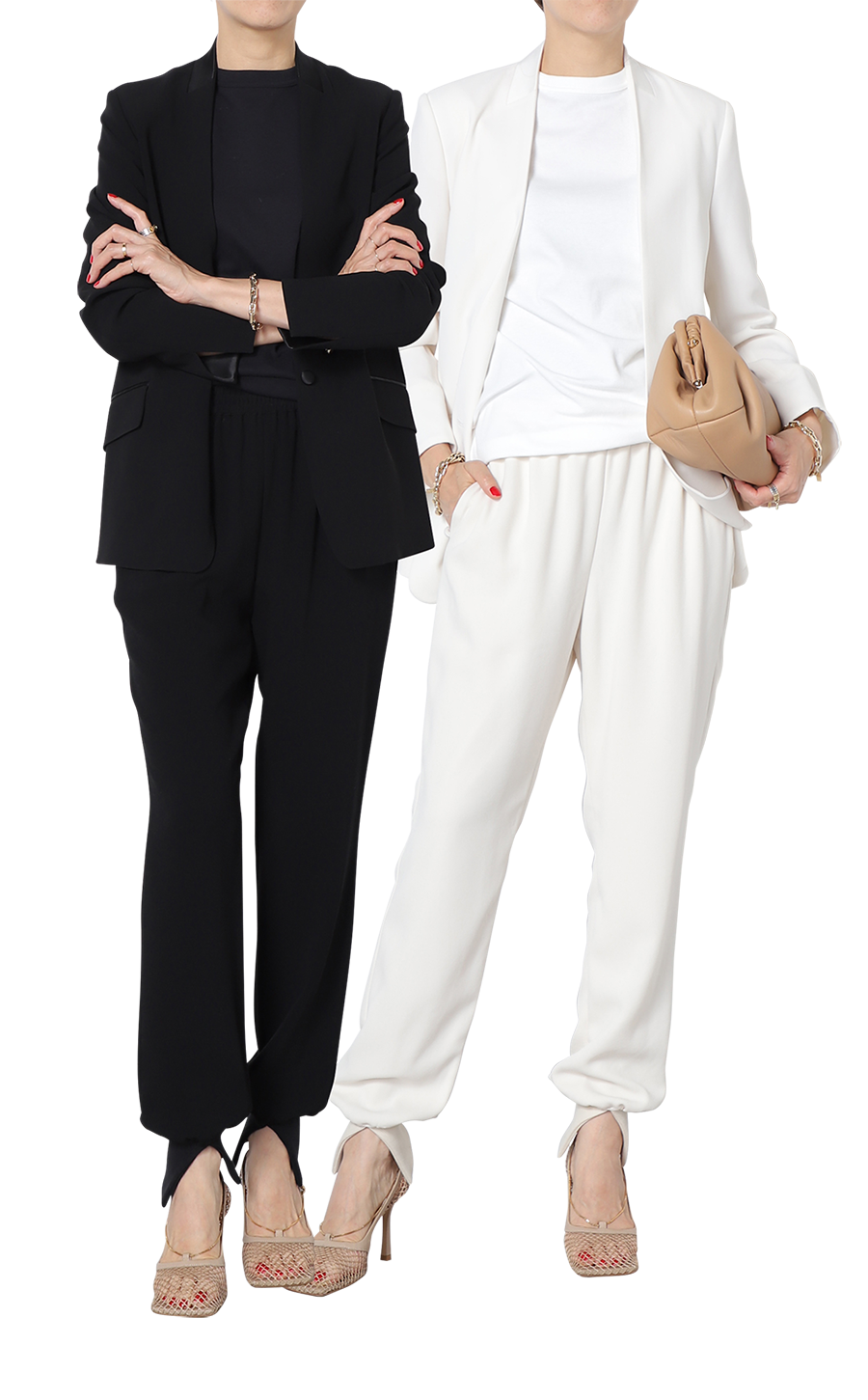 The classic black is also in the mood to be worn as a set-up. 裾リブパンツの新色はオフホワイト。定番の黒もセットアップで着るのが気分。