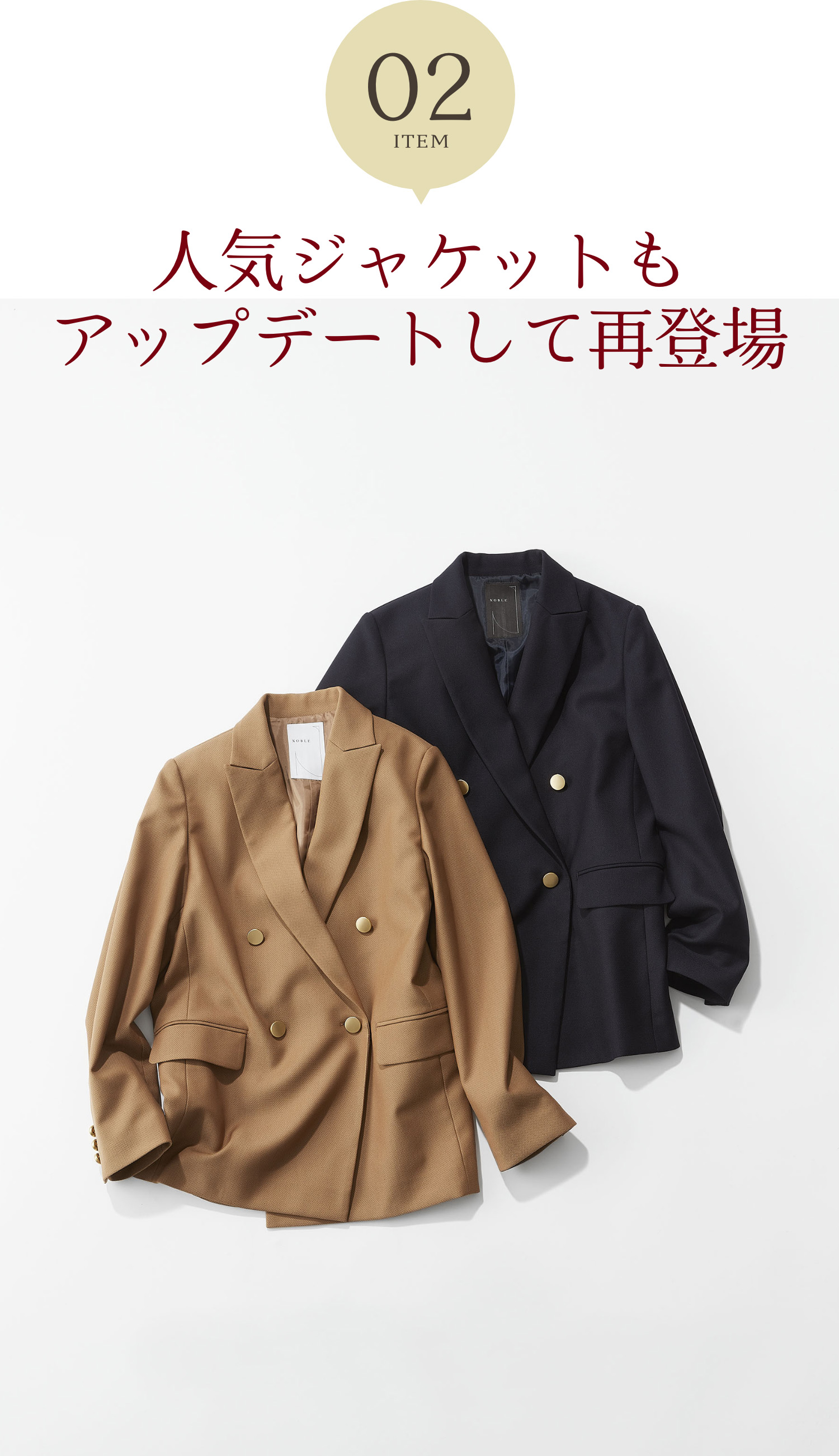 NOBLEで人気のダブルジャケットを、素材とパターンを今の気分に新しくアップデートした新定番ジャケットが登場!女性らしさを引き立てるシルエットにこだわり、細めの襟にする事で顔周りをシャープな印象に。またゴールドのメタルボタンで女性らしい柔らかさもプラス。オンオフ兼用でスタイリングを楽しめる万能アイテムです。