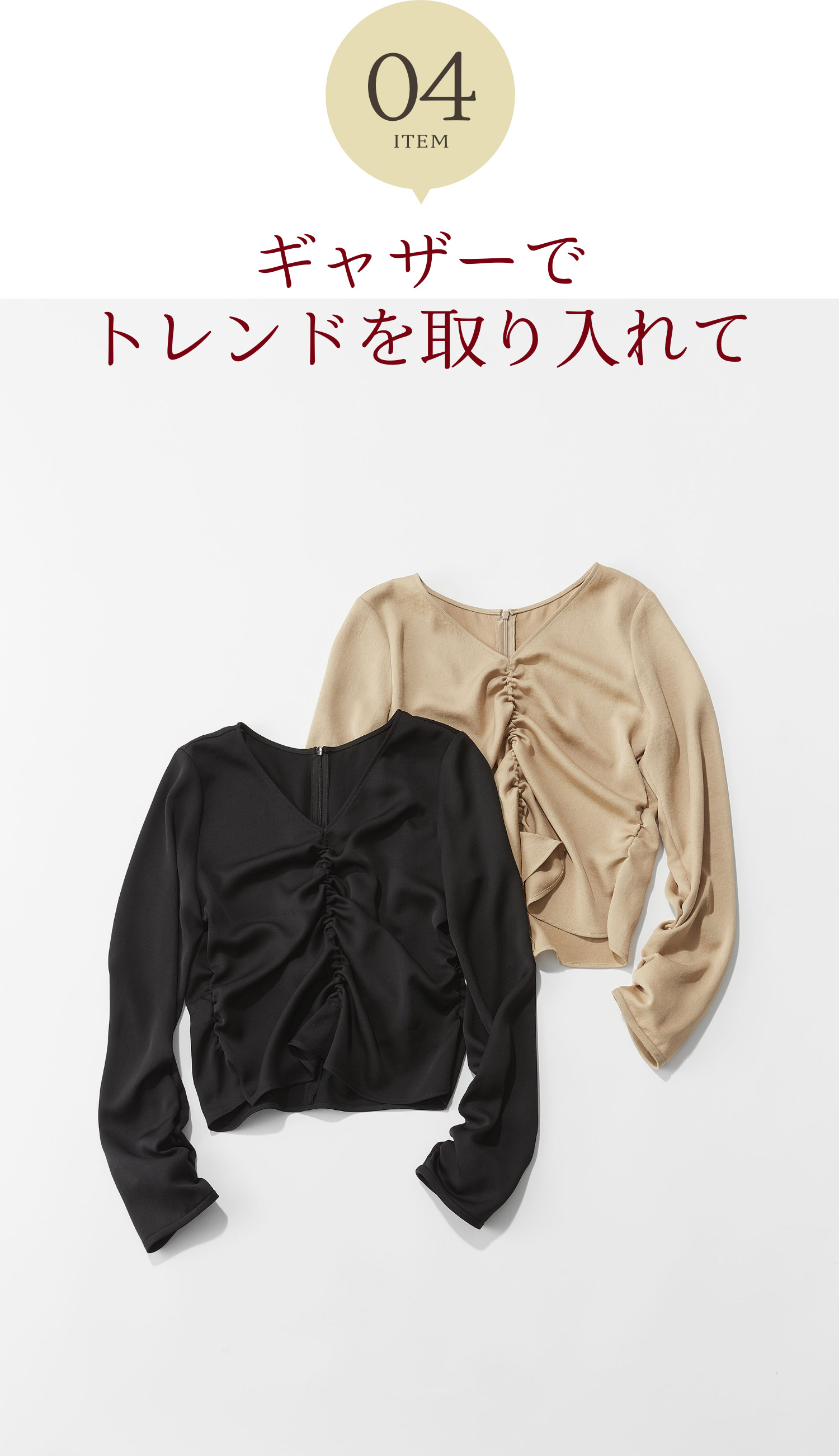 女っぽいシャーリングと、着丈が短めで袖丈が長い今っぽさのあるブラウスには、レースのスカートや、艶感のあるボトムを合わせてしまうとトゥーマッチ。逆にブルーデニムなどカジュアルなボトムを女っぽくコーディネートするのがいいのではないでしょうか。シャーリングを生かしてアウトに着て、動きによっては若干お腹が見えるかな?と懸念する場合は、ベルトをしてしっかりとウエストをマークしてあげるといいと思います。