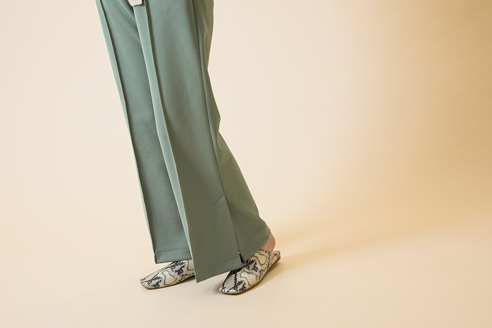 くすんだグリーンのパンツ&パイソンシューズで辛口に仕上げてほっこり感を回避。