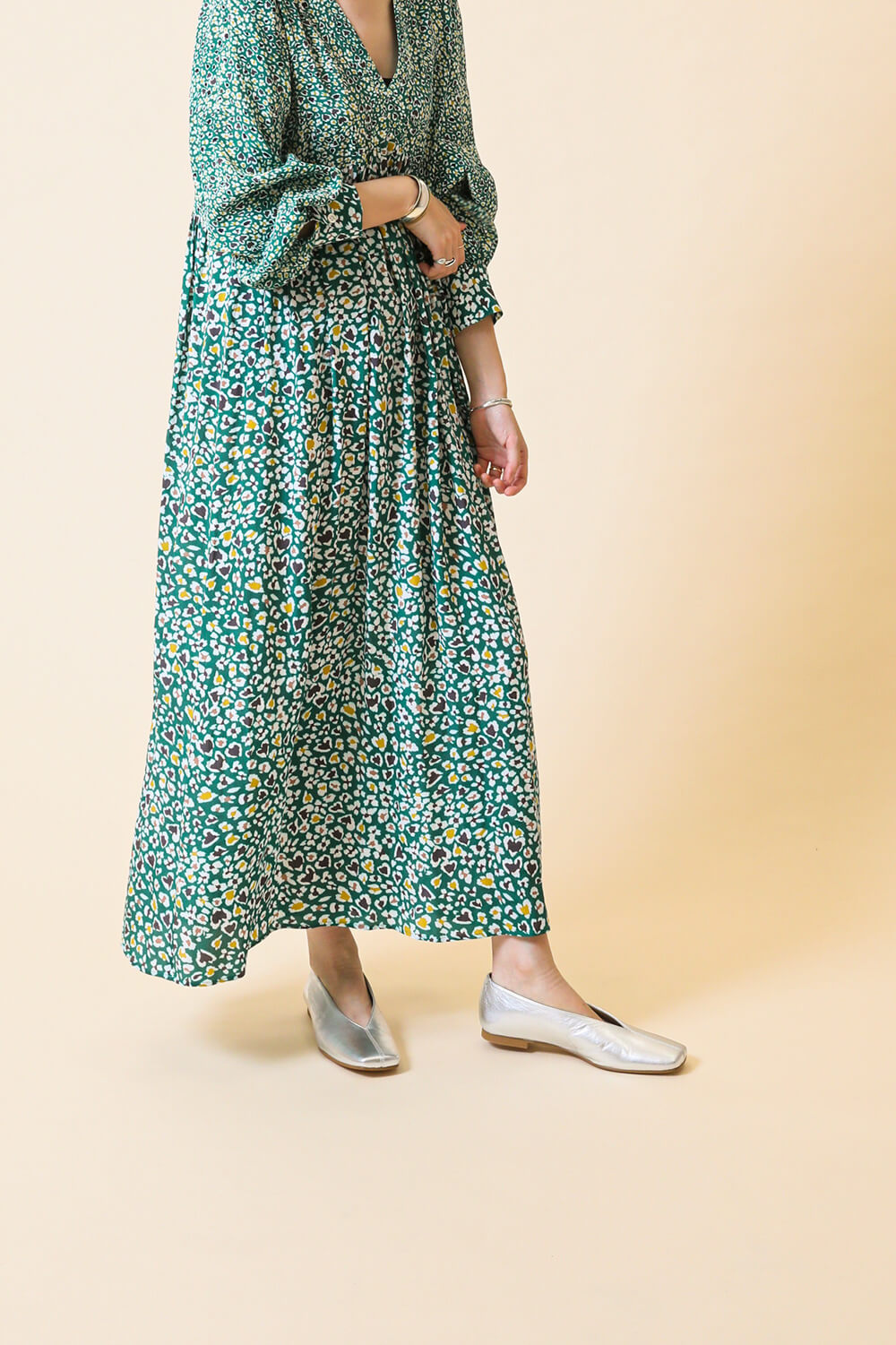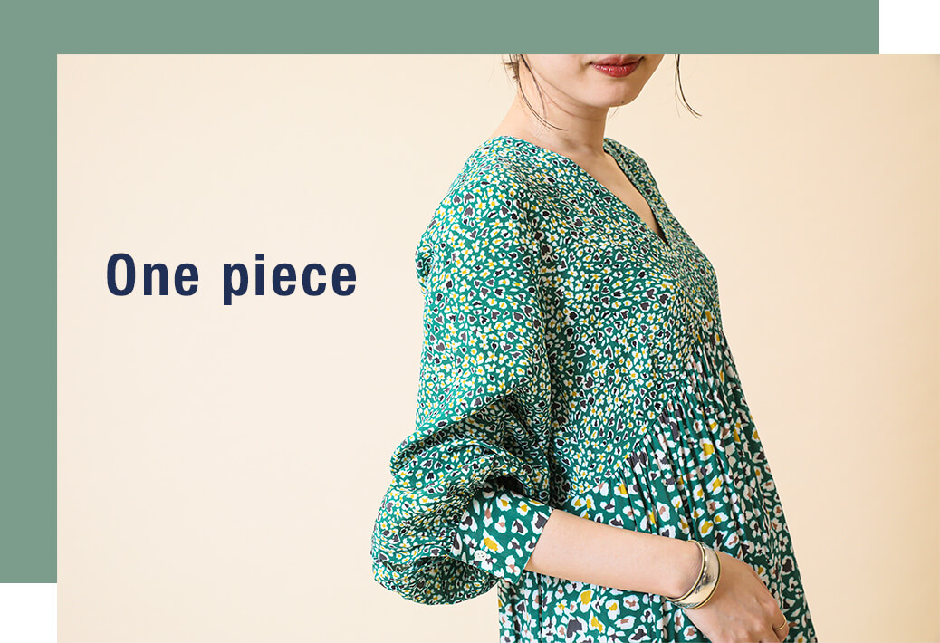 新しい季節の訪れを感じさせる、鮮やかなグリーンが爽やかなプリントのワンピース。