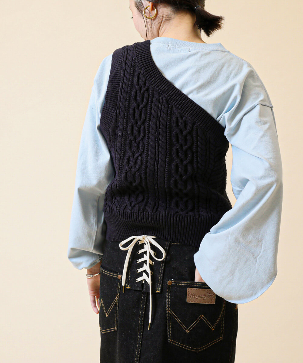 この春注目のニットベストの中でも、さらに旬度を高めるワンショルダーのデザインが登場。