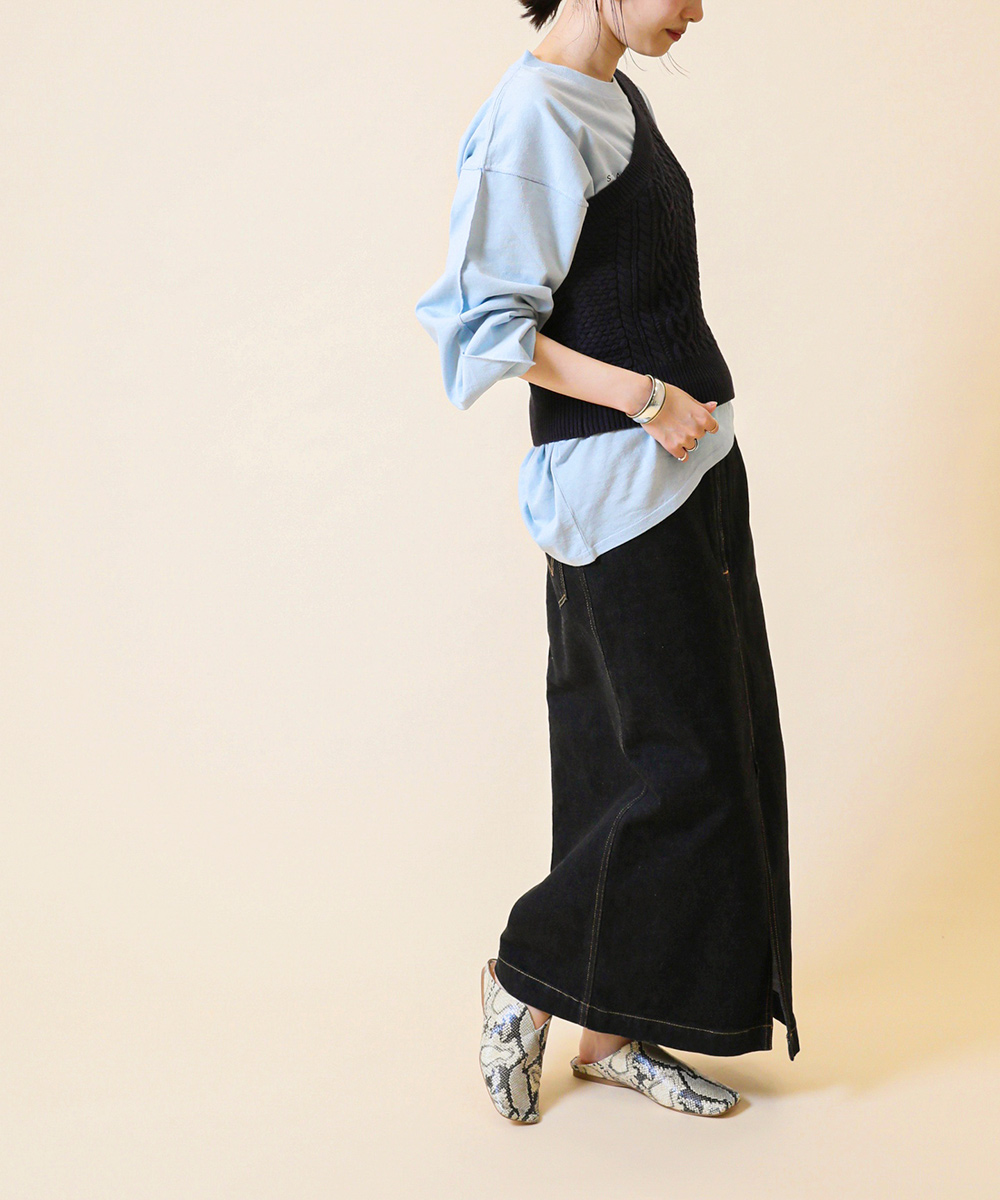 デニムマキシスカートで縦長シルエットを強調すれば、スタイルアップ効果にも◎。