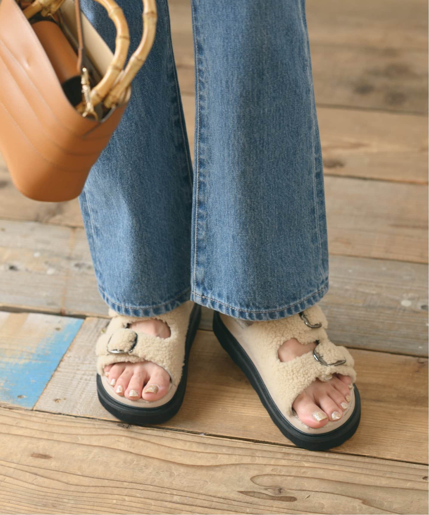 大人可愛いもこもこサンダルに夢中!JOURNAL STANDARD L’ESSAGEはトレンドのファーが豊作。インソールからさりげなくファーをチラ見せして、足元に華やかなワンポイントを添えて。
