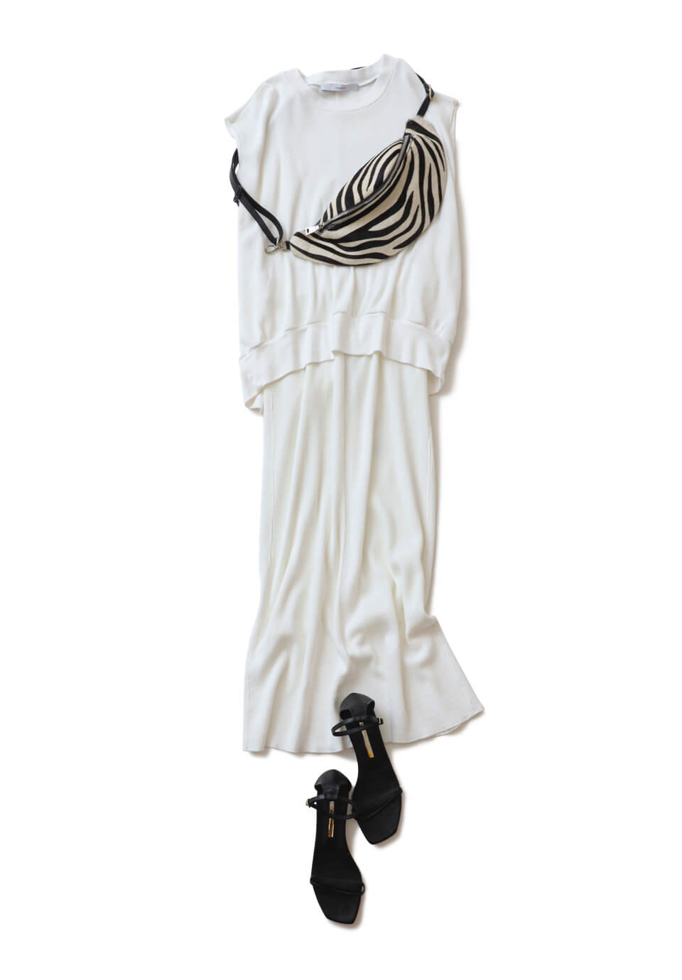 白でまとめたクリーンなフェミニンコーデ。ふんわり優しく体を包むワッフル素材のセットアップなら、ワンピースとは一味違う今年っぽいリラクシーカジュアルが簡単に。スッキリしたIラインシルエットのマーメイドスカートも今年っぽい。アニマル柄のボディバッグを仕上げにプラスして、鮮度を高めて。