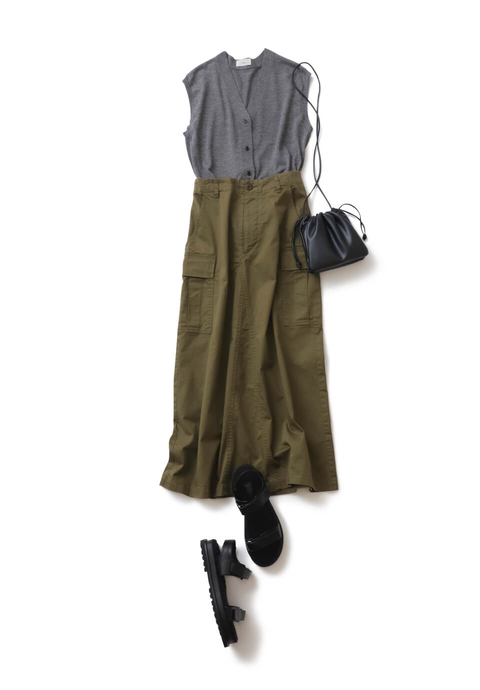 晩夏から秋にかけてのトレンド大本命アイテムの一つ、ベスト。1枚あると重宝するのが、オンにもオフにも使えるグレーのニットベスト。まだ暑い日はレイヤードせず、ボタンを閉めてプルオーバー風に着こなして、マキシスカートにタックイン。ミニショルダーとサンダルは黒でまとめて。