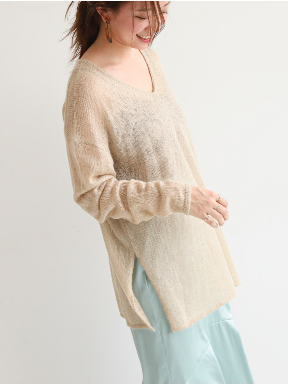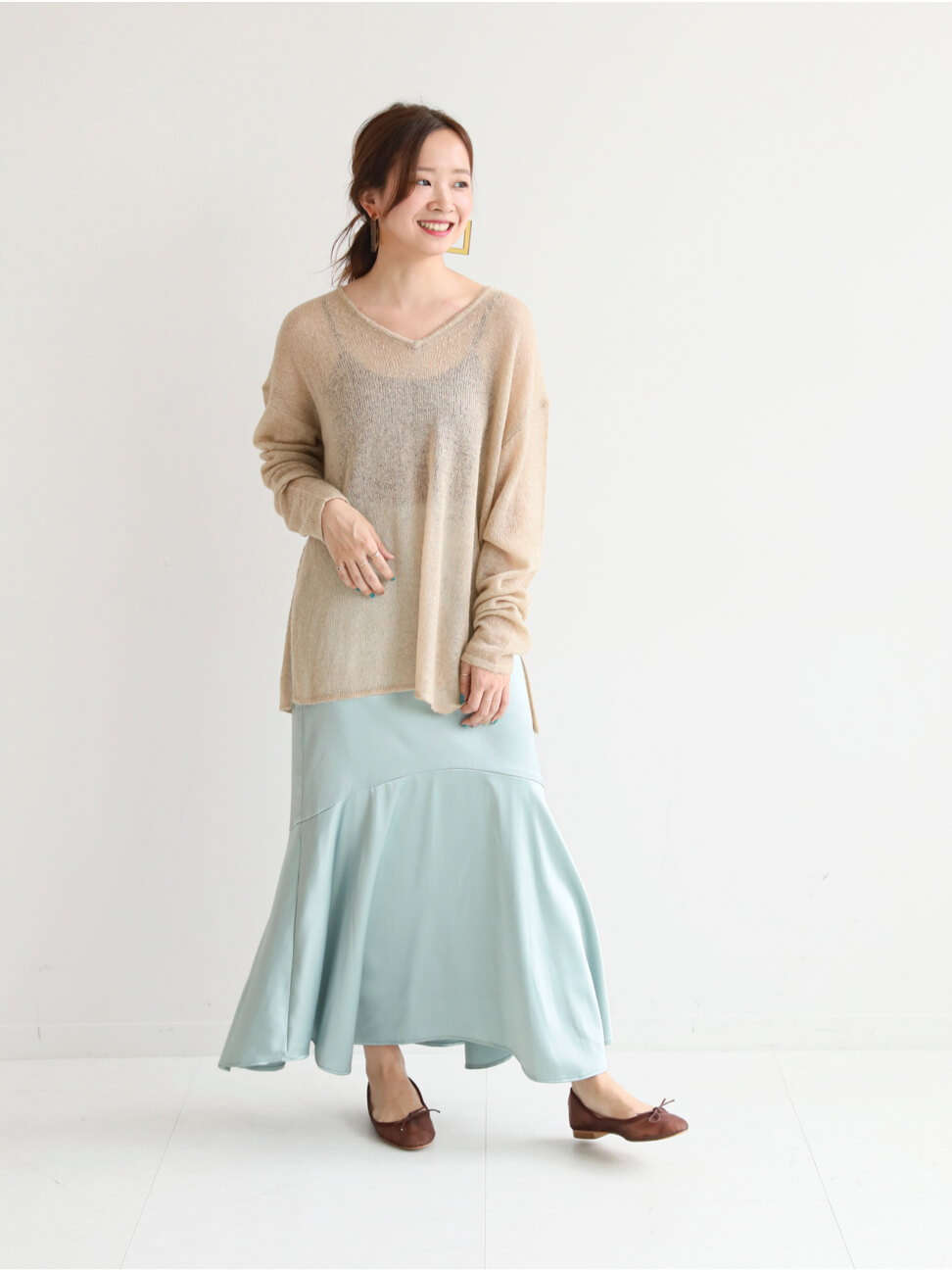 - キャミソール&マキシスカートの夏コーデの上から重ねたのは、ルーズなシルエットとヌーディな透け感がドキッとする女らしさを醸し出す、フェミニンなすかし編みニット。シンプルなベージュのVネックだからアイテムを選ばず着回しやすく、ブリッジアイテムとして重宝しそう。