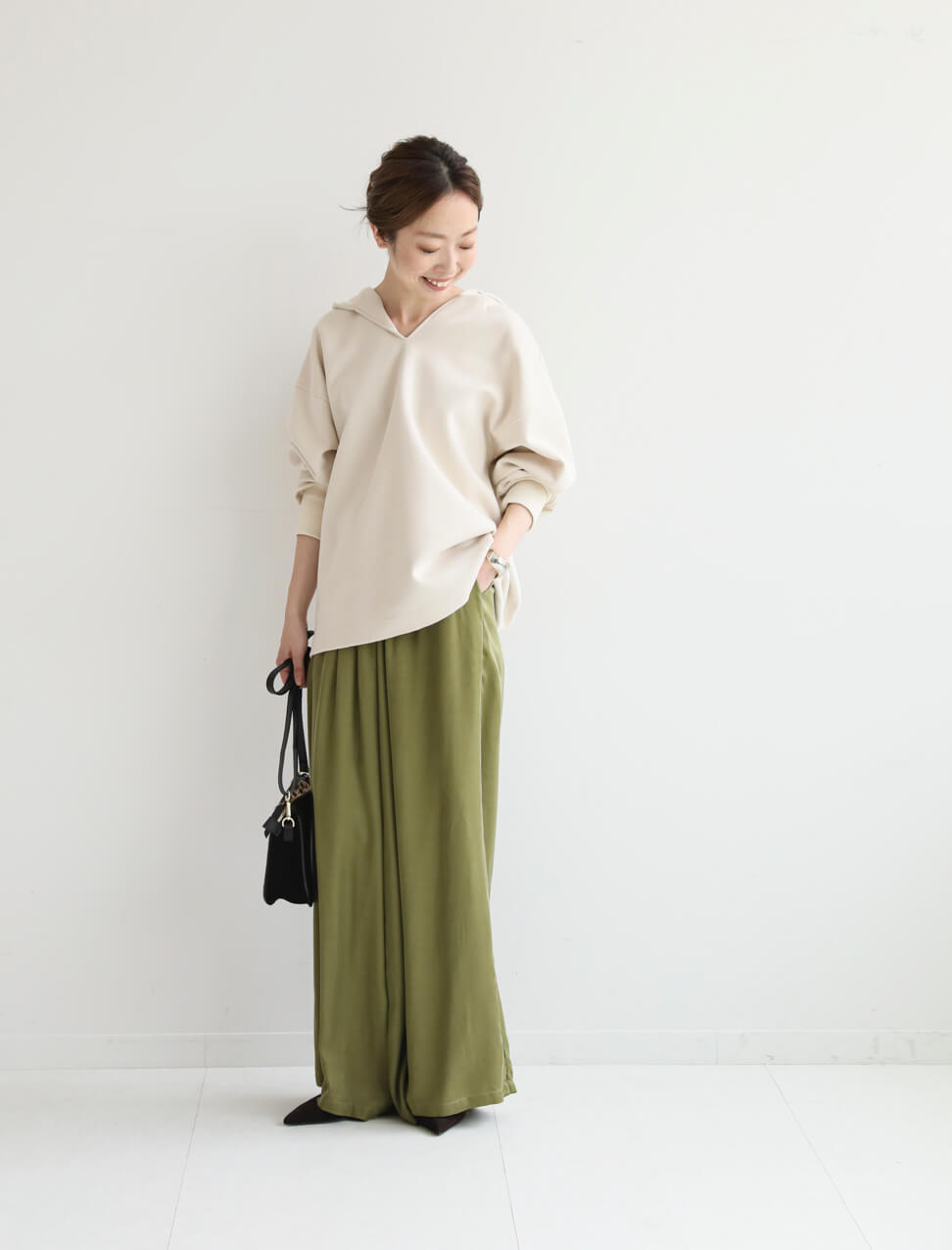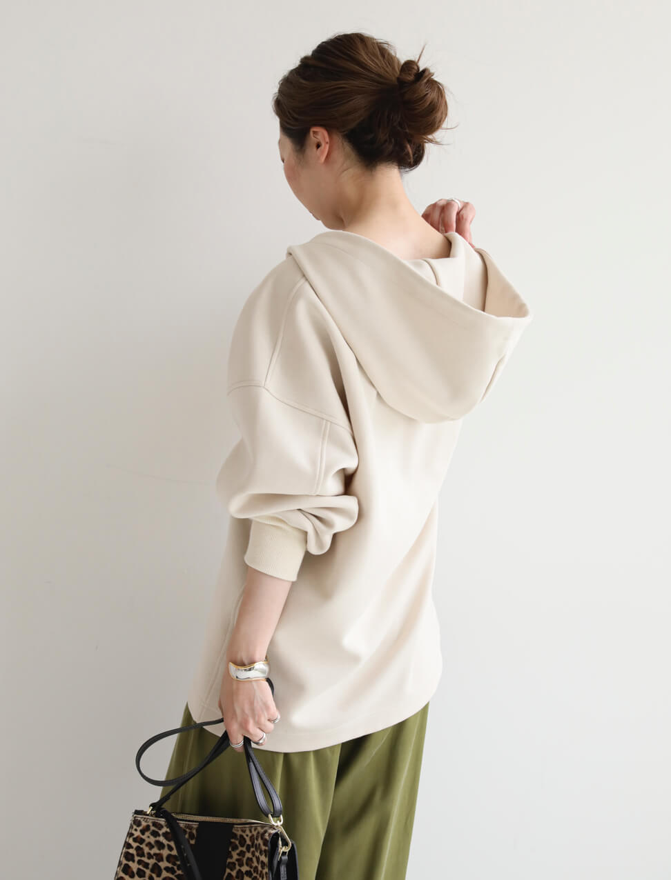 - ヘルシー志向継続の今年もパーカはマスト。程よくルーズな落ち感や襟のVネックの開きなど、どこかフェミニンなムード漂う1枚で差をつけて。涼素材のワイドパンツを合わせれば、今すぐ取り入れられそう。レオパードバッグで秋らしいワンポイントを。