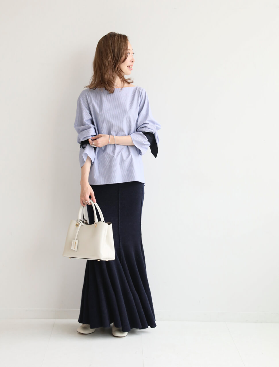 - 袖にベルトディテールをあしらった、マスキュリンとフェミニンが絶妙なバランスのALANI the greyのブラウス。ベルト部分とトーンを合わせたマーメイドスカートをコーデして、知的な女らしさ漂う秋コーデが完成。バッグとシューズは白で統一してクリーンな印象に。