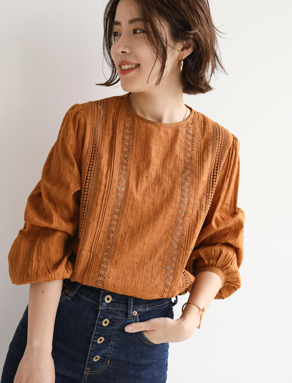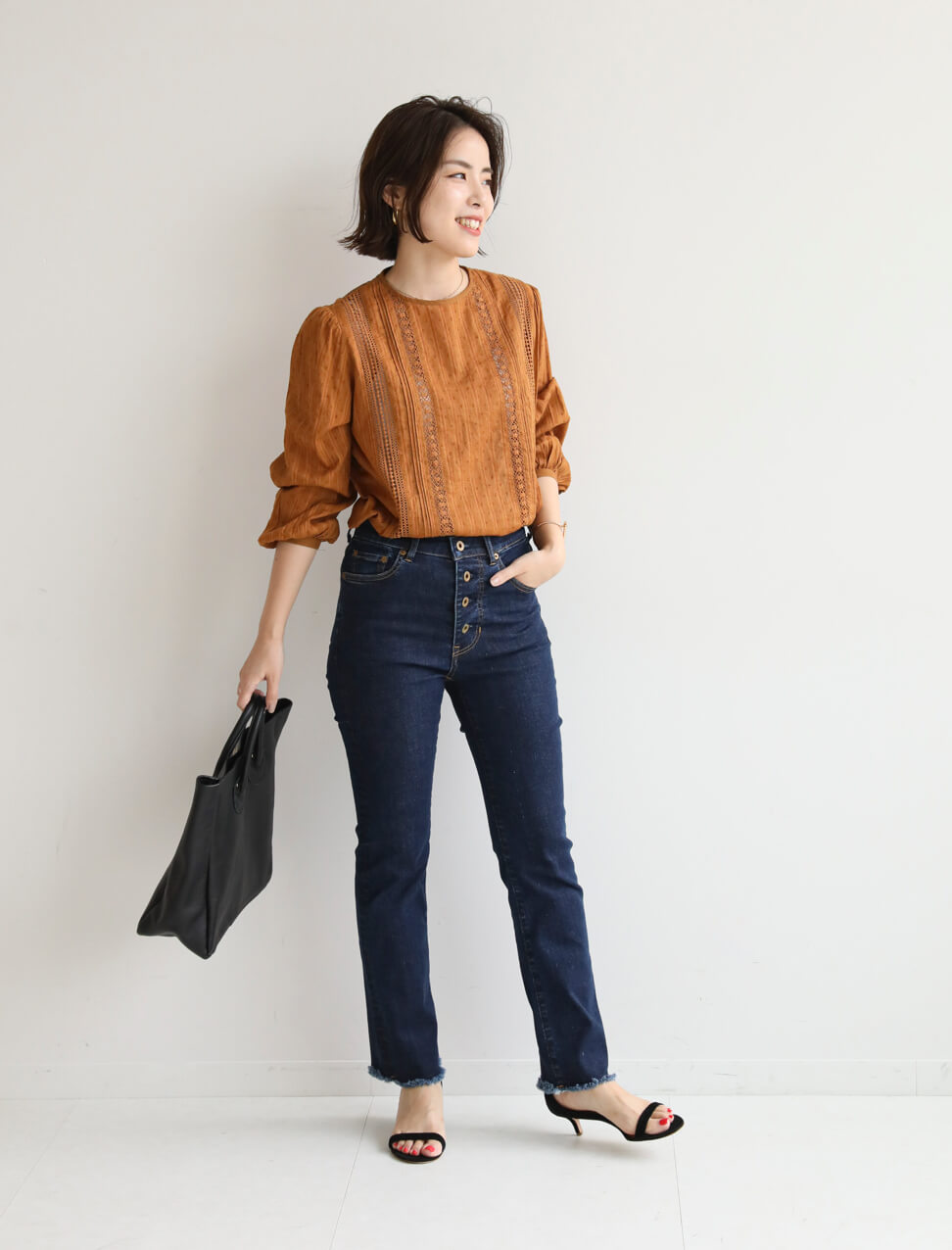 - 手持ちのデニムのトップスを秋らしいキャメルのブラウスに更新すれば、簡単に秋コーデを先取り。ドビーレースがフェミニンな華やかさも加えてくれるから、デニムとの甘辛ミックスコーデに最適。華奢な黒のストライプサンダルでドキッとする女らしさも添えて。