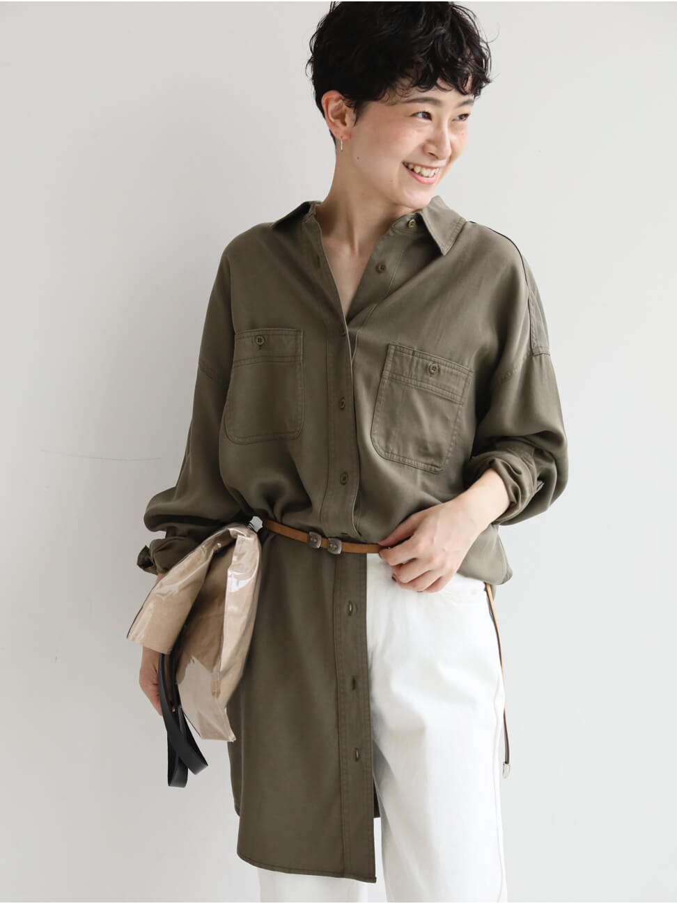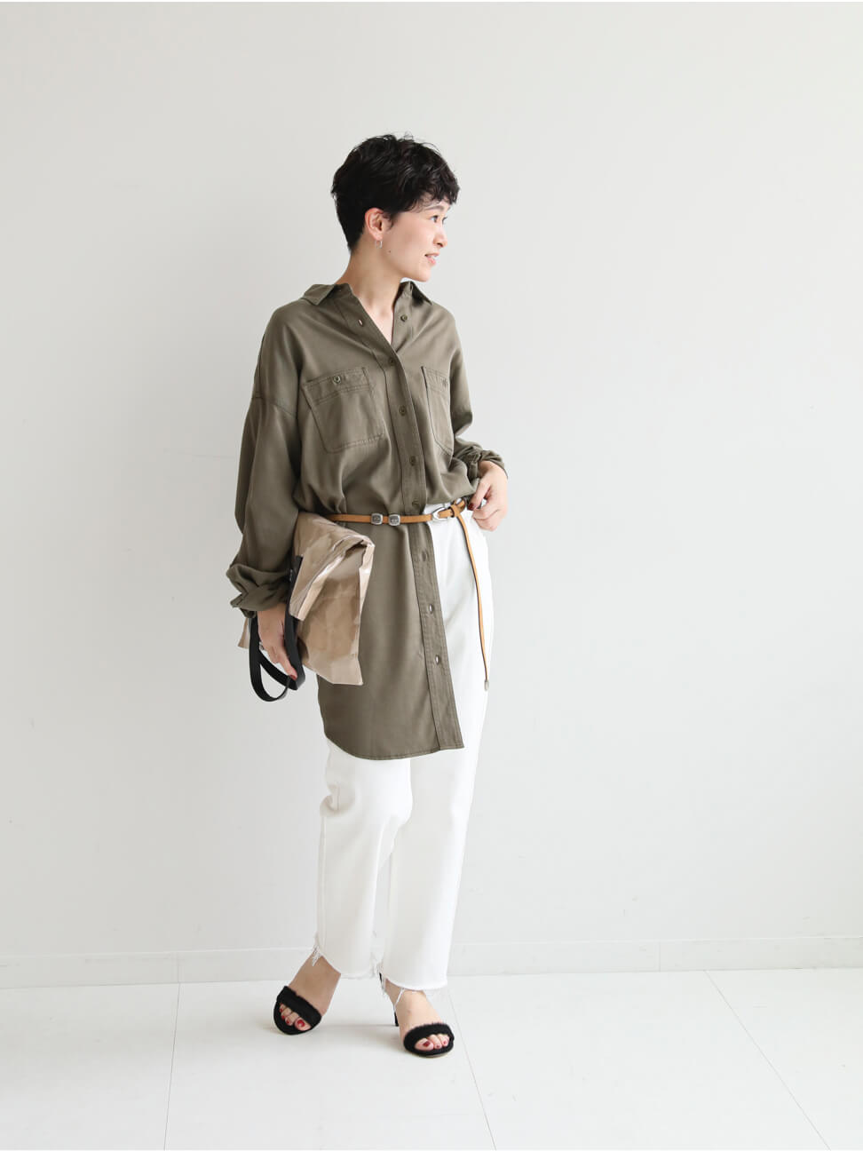 - 秋はワーク×フェミニンの掛け算にもトライしたい。ダブルポケットがカジュアルムードたっぷりのカーキシャツを、ホワイトデニムと合わせて大人っぽく昇華。半分だけラフにボトムインして、ベルトをポイントにする着こなしテクにも注目。足元はヒールが鉄則。