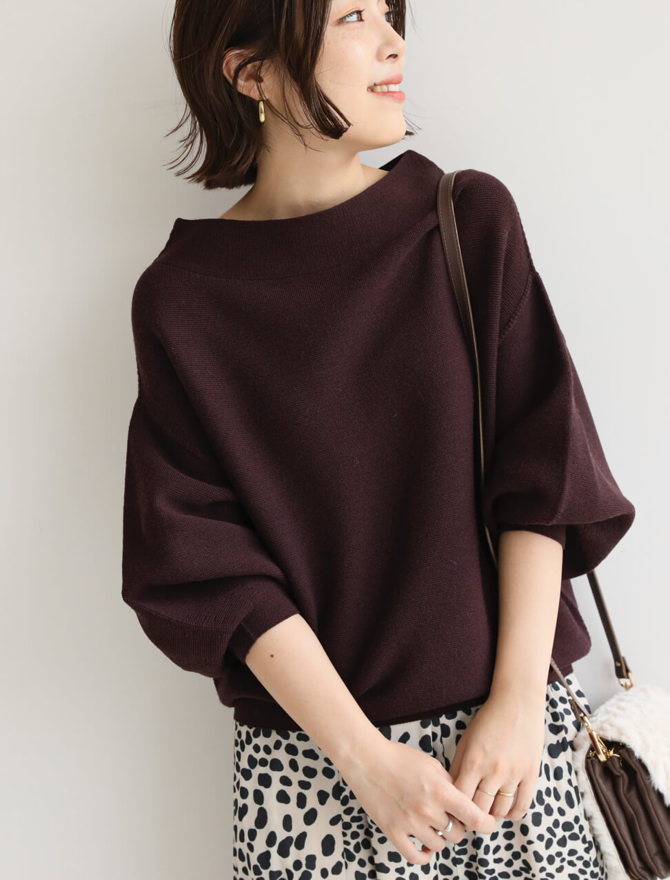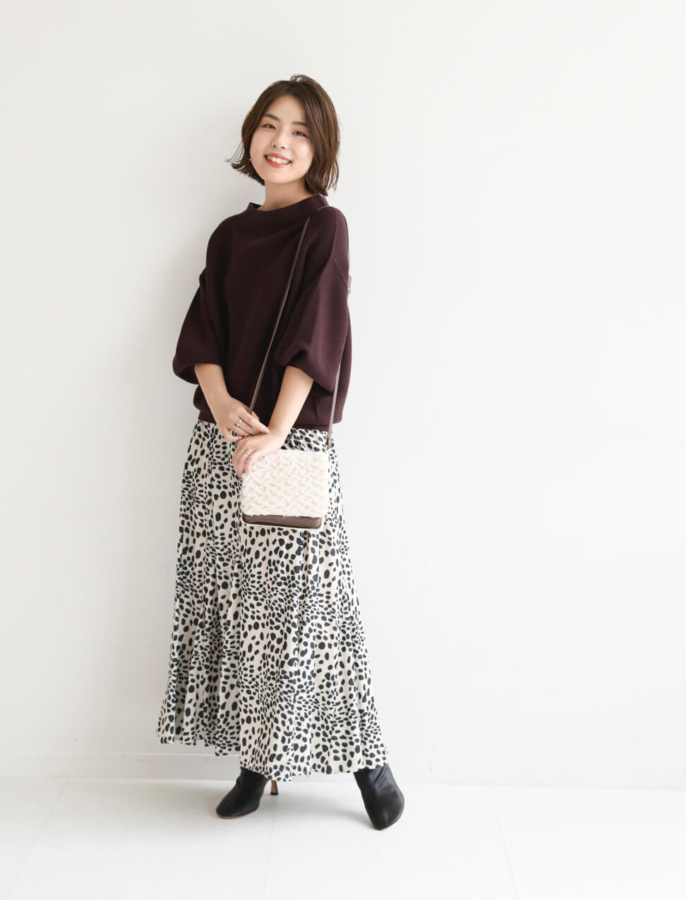 - ブラウンのバルーン袖トップスに、アニマルプリントのマキシスカート。どちらもこの秋冬のトレンドど真ん中の旬コーデ。トップスはボリューミーな袖とニュアンスネックが着映え効果も抜群。もこもこのショルダーバッグとブーツを合わせて、さらに秋らしく。