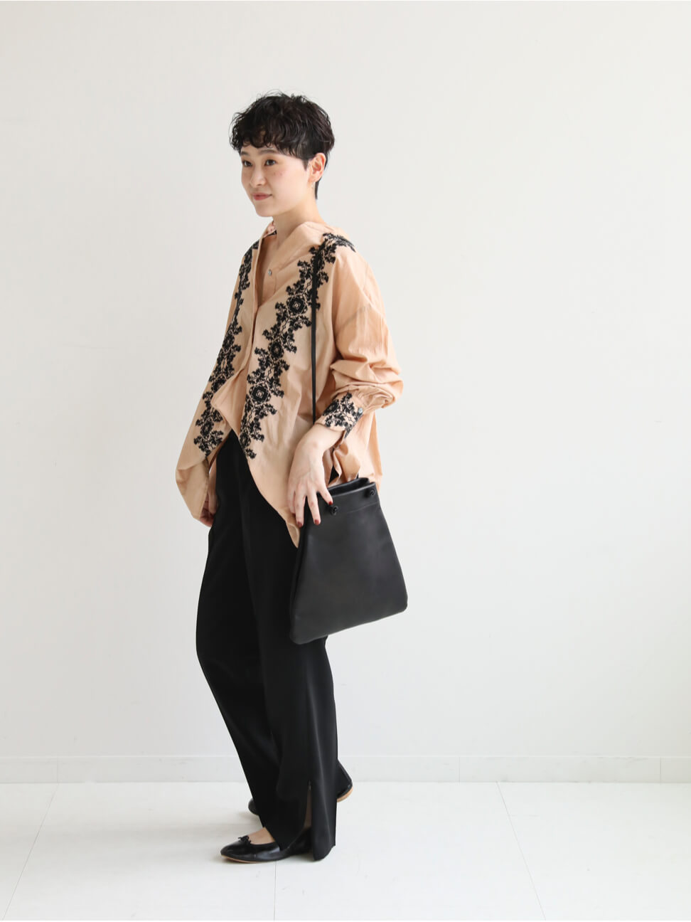 - 旬のボリュームシルエットと大胆にあしらった刺繍が着映えるチュニックが主役。他のアイテムは黒でまとめれば、コーデに統一感が出て洗練度アップ。トライバルな印象のチュニックを、あえてモードなバッグ&シューズと掛け合わせてシティライクに着こなして。