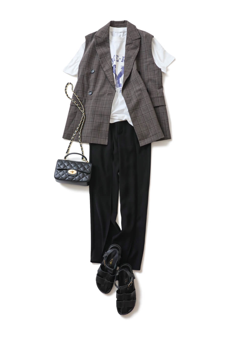 大きなロゴがカジュアルな白Tシャツの上に、秋トレンドのテーラードベストを重ねてムードを一新。キレイめにはけるイージーパンツをつないだ、かっちりしすぎないラフな着こなしが今っぽい。足元はサンダルでOK。ゴールドチェーンバッグがクラシカルなアクセントに◎