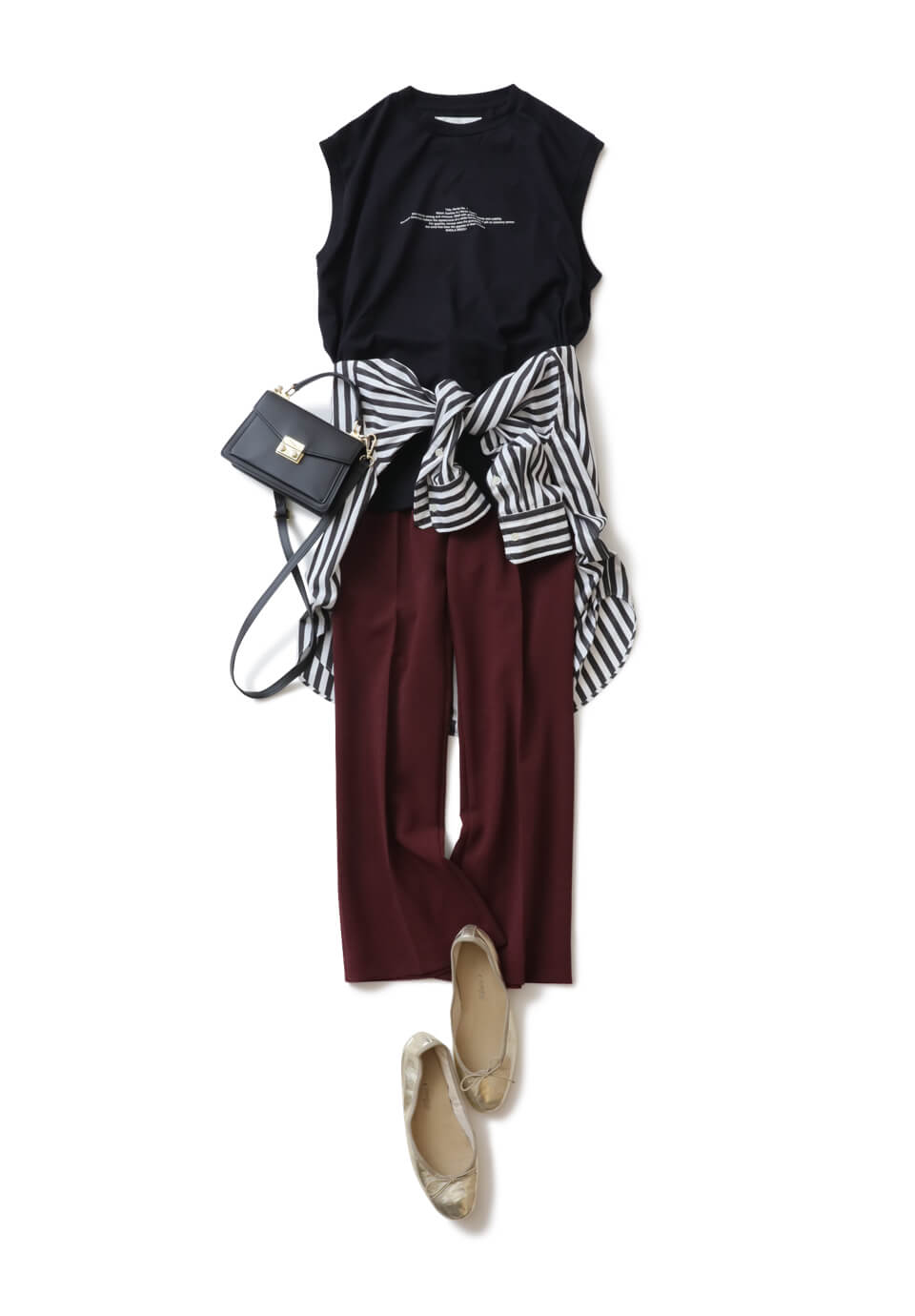 残暑が厳しいけど秋ムードを取り入れたい時は、いつものワンツーコーデをブラックやボルドーといったクラシカルな配色で。トップスは、背中の大きなポニープリントがアクセント。バレエシューズも秋っぽさを感じさせるゴールドをチョイス。シャツを腰巻きしてリズムを加えて。