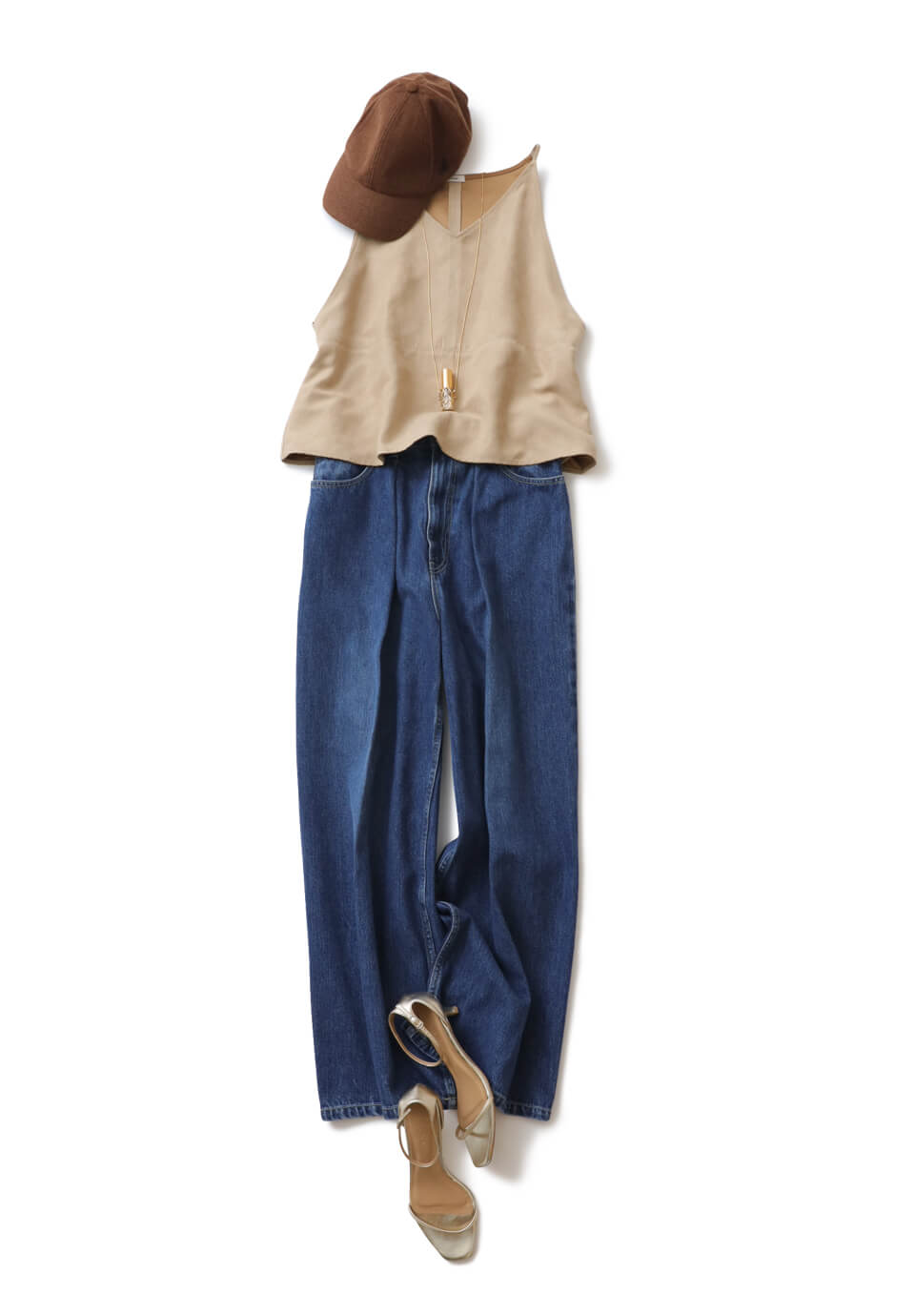 キャミソール×バギーデニムのヘルシーなワンツーコーデ。夏らしい組み合わせだけど、キャミソールはフェイクレザー、デニムは濃いブルーをセレクトして季節をスイッチ。シンプルコーデにぴったりなアトマイザーネックレスがアクセント。華奢なストラップサンダルも、アクセに合わせてゴールドが正解。