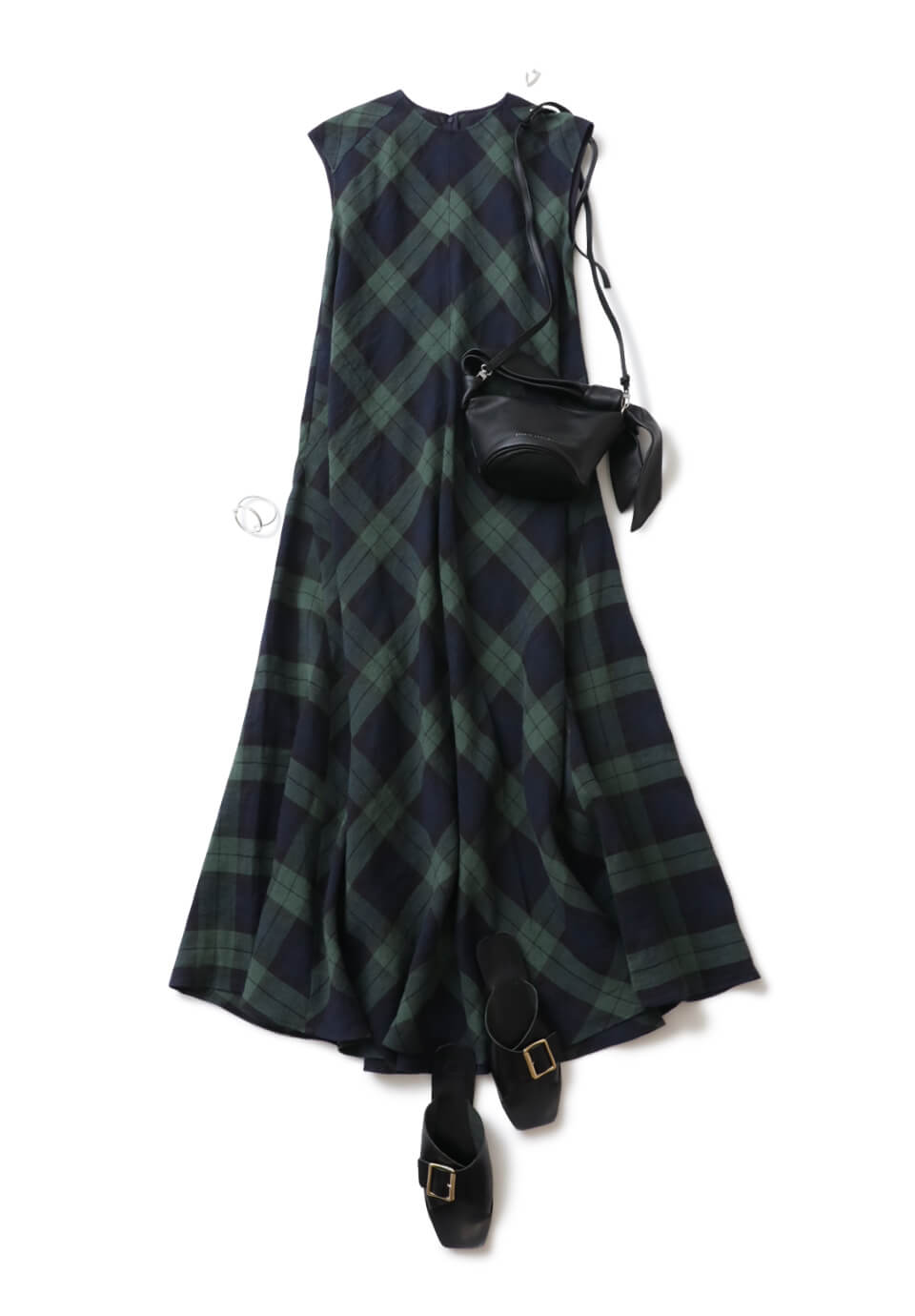 今から秋まで長く活躍する着映えワンピースを1枚でさらっと着こなしてコーデを完成。トラッドだけどドラマティックに華やぐネイビー×グリーンのタータンチェックが最適。まだまだ暑い今の時期は、サンダルを合わせて抜け感をプラス。ボリュームのあるバングルとピアスを片耳だけつけて、ワンポイントを。