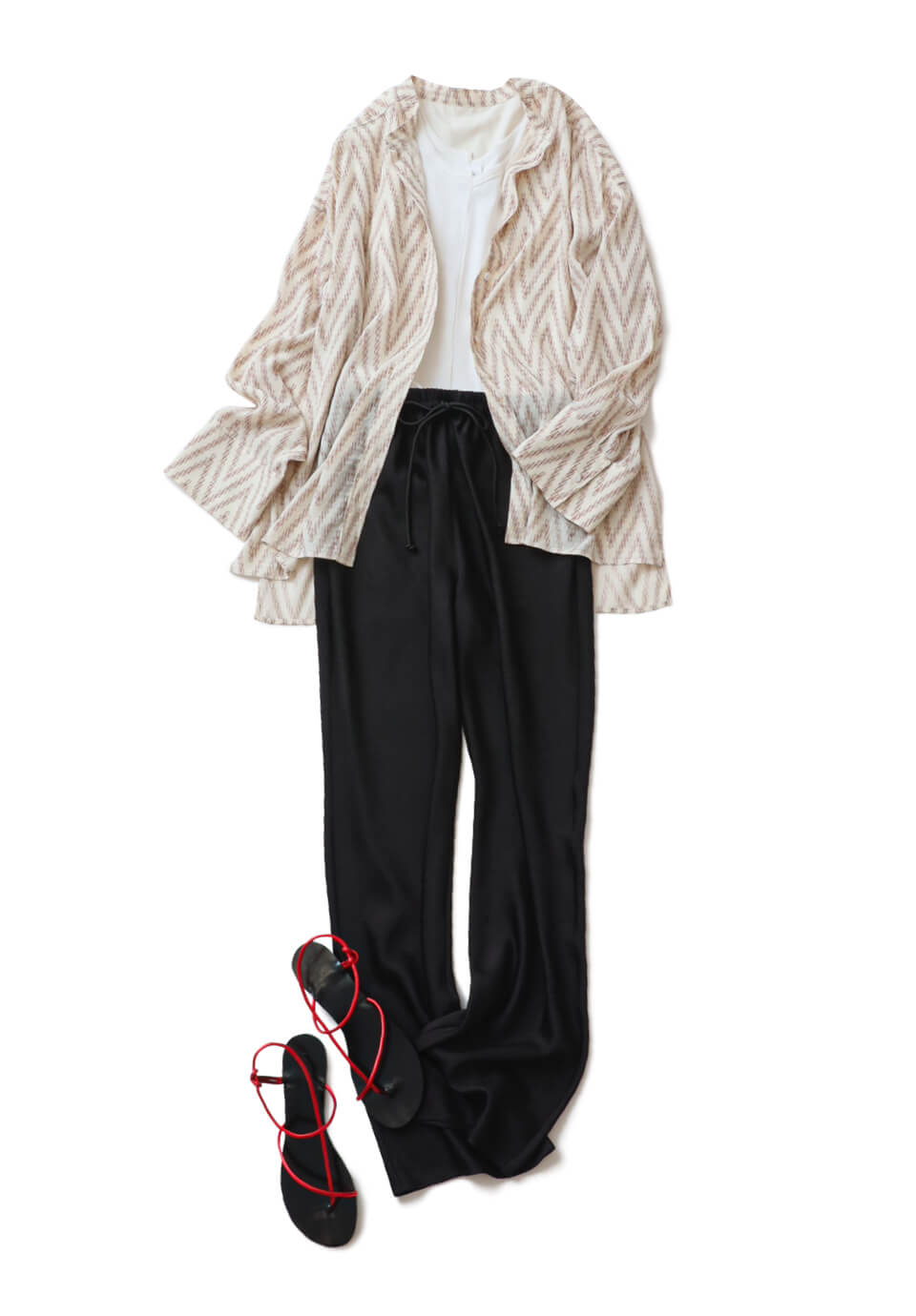 白タンクトップに黒サテンパンツを合わせたリラクシーなモノトーンカジュアル。夏にたっぷりヘビロテした組み合わせだから、ちょっぴりマンネリ気味・・・そんな時は、キャッチーな柄物シャツの力を借りて。ラメ糸のジグザグがモダンながら、白ベースなので着やすくて◎。コードサンダルのレッドを差し色に。