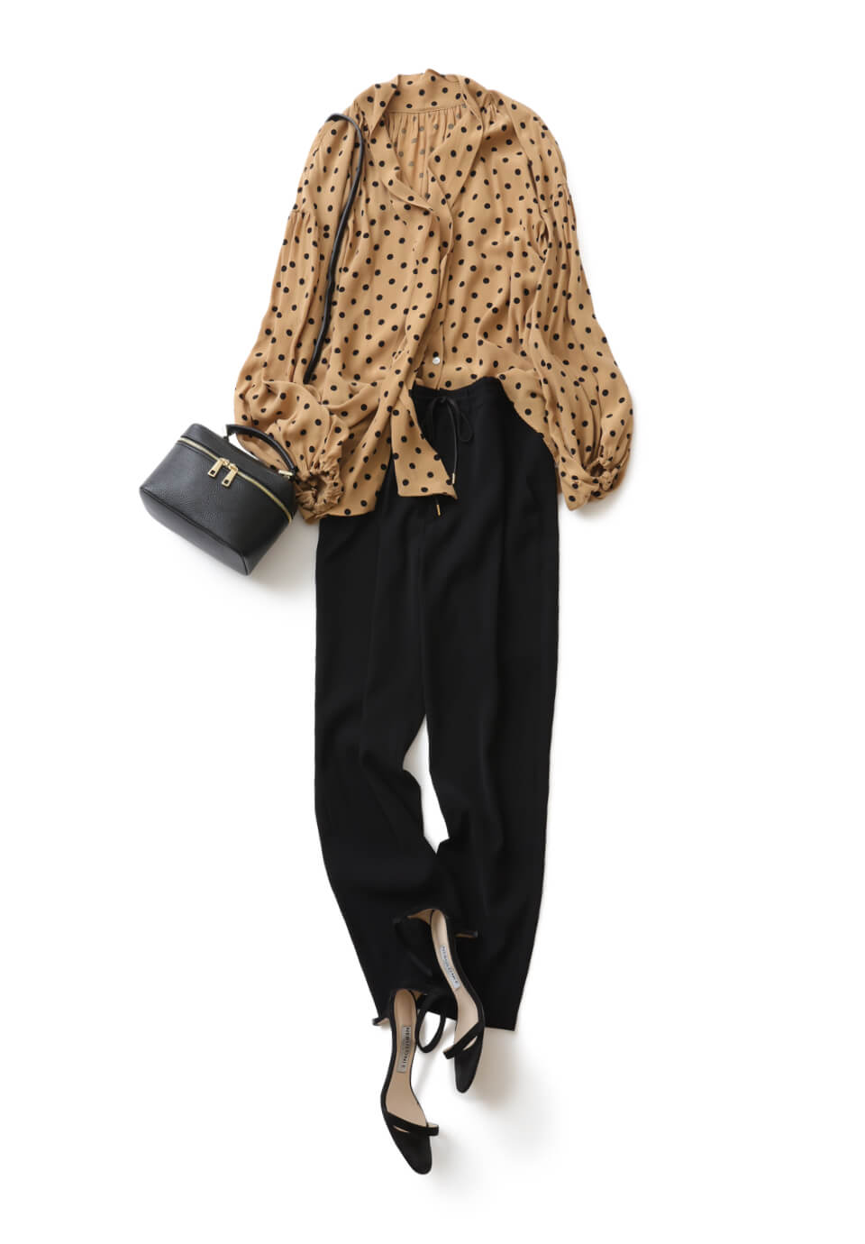 晩夏から秋までたっぷり堪能できる、とろっとした素材のレトロなボウタイブラウス。上品なキャメルのドット柄なら、一点投入で秋モードのスイッチがオン。大人っぽくはけるジョガーパンツでリラクシーな抜け感を加えつつ、レディな黒小物でクラスアップ。バッグはこの秋気になるバニティバッグをチョイス。