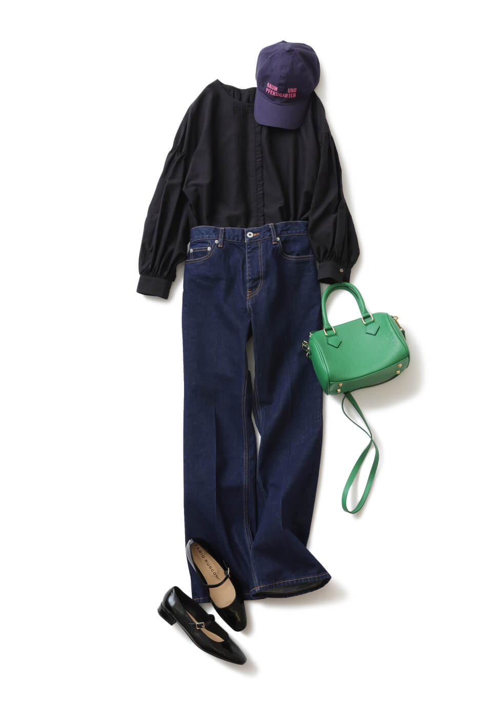 今から秋の服を楽しみたい!そんな気分の日はブラウスから更新してみて。フロントのフリルやぽわんと広がるスリーブが女っぽい黒ブラウスを、ブルーデニムにタックイン。足元もサンダルから、秋トレンドのレディなストラップシューズにチェンジ。鮮やかなグリーンバッグが全体をブラッシュアップ!