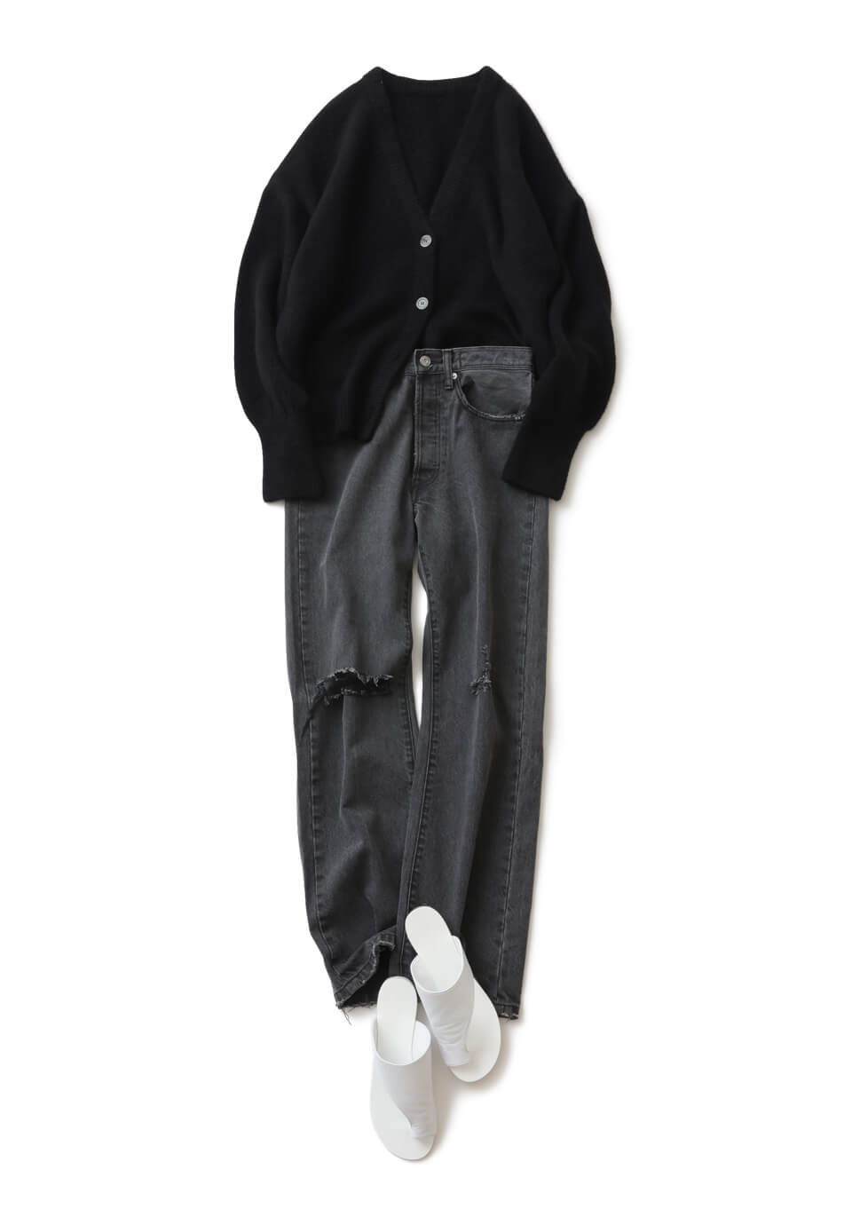 季節をまたぐスイッチシーズンに欠かせないカーディガン。ゆるっとしたコクーンシルエットの黒カーデは、ハンサムでいて華奢な女っぽさも漂う、大人コーデの最適解。ダメージがポイントに効いたブラックデニムにラフにインして、スタイリッシュなワンツーコーデをメイク。足元は白サンダルで軽さをプラスして。